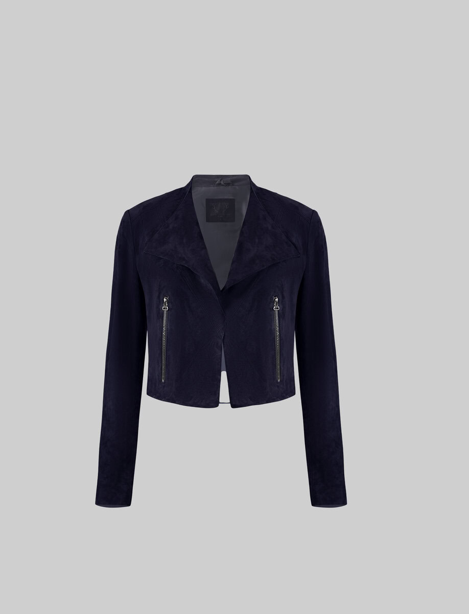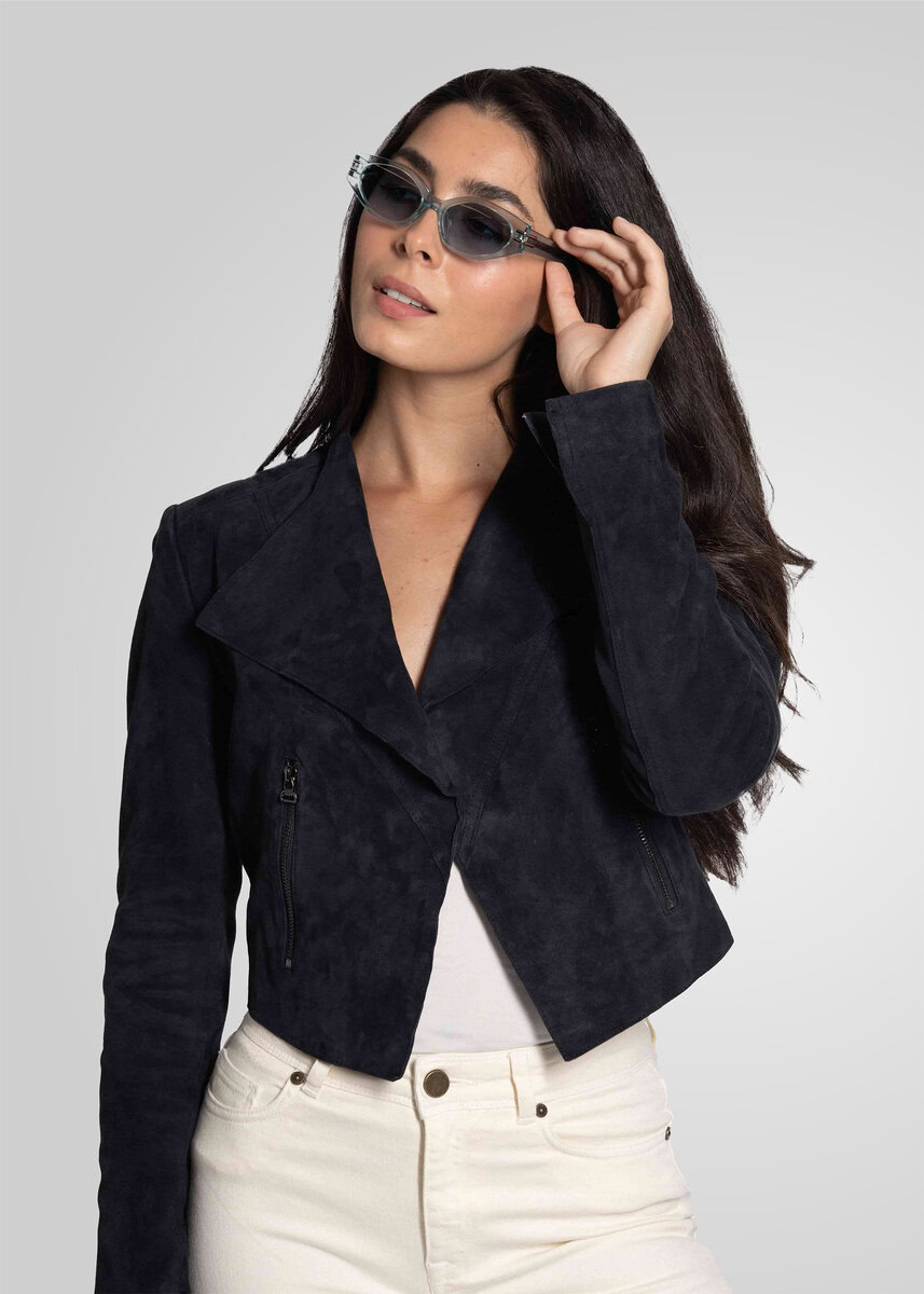 ה־ADRIAN-S הוא ז׳קט זמש עכשווי בעל מראה נקי וקווים אלכסוניים בחזית.
