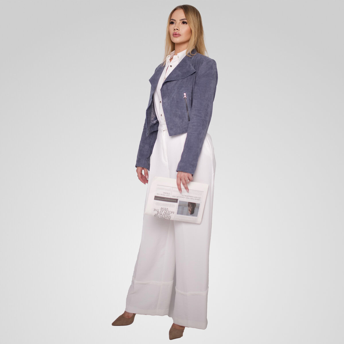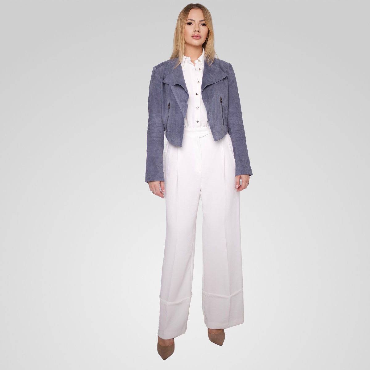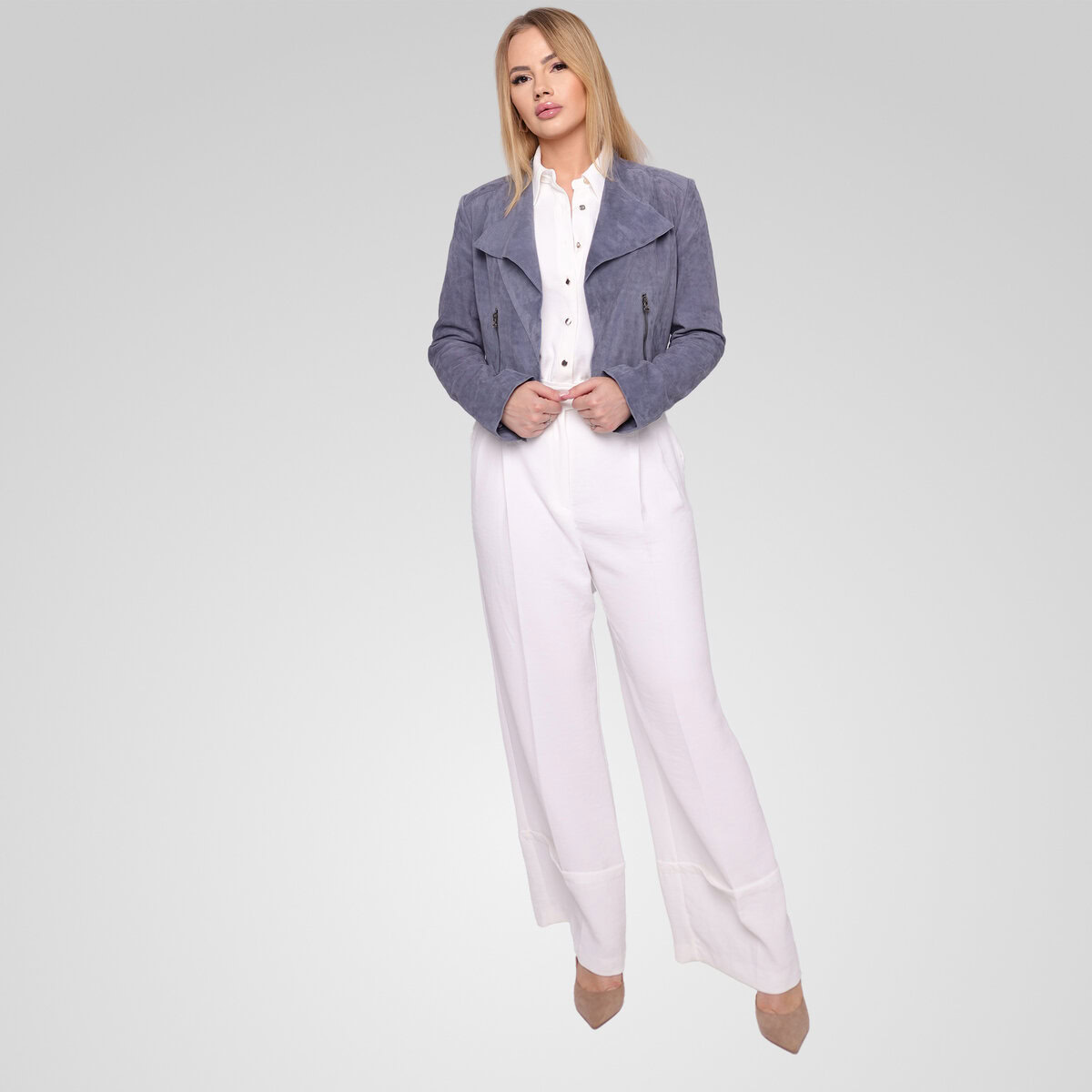 ה־ADRIAN-S הוא ז׳קט זמש עכשווי בעל מראה נקי וקווים אלכסוניים בחזית.