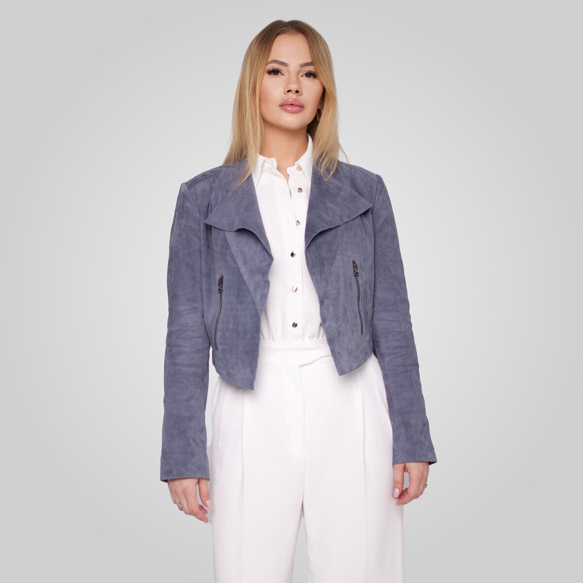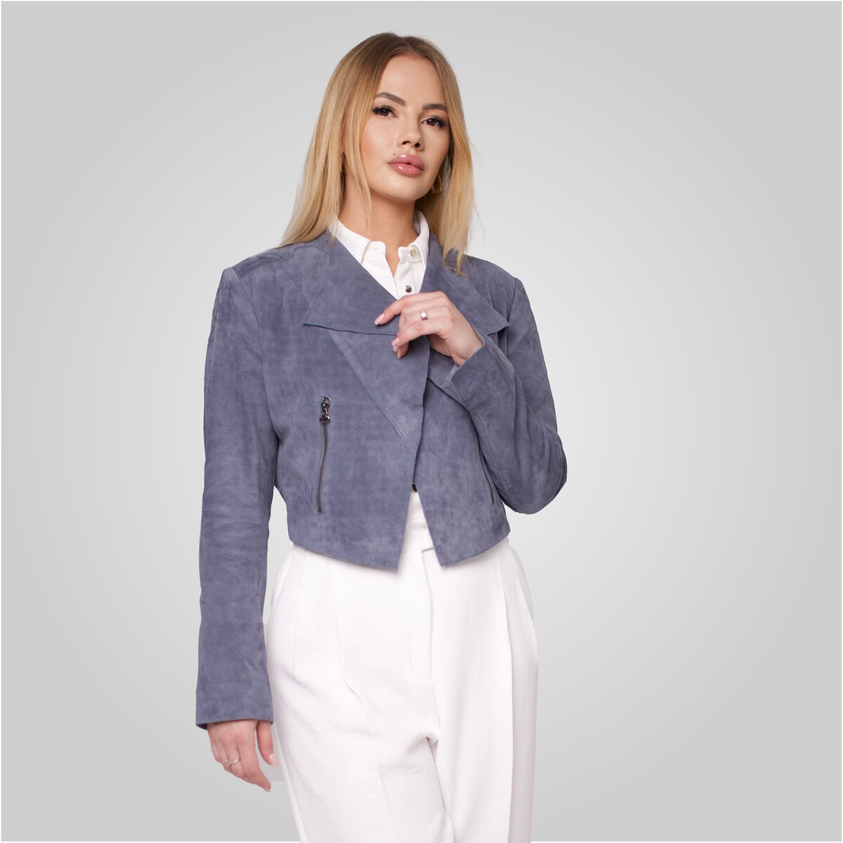 The ADRIAN-S is a modern suede jacket with a clean, angled front. It features an off-center zip closure, zip pockets, and a soft feel. Perfect for adding a fresh, stylish touch to any outfit.