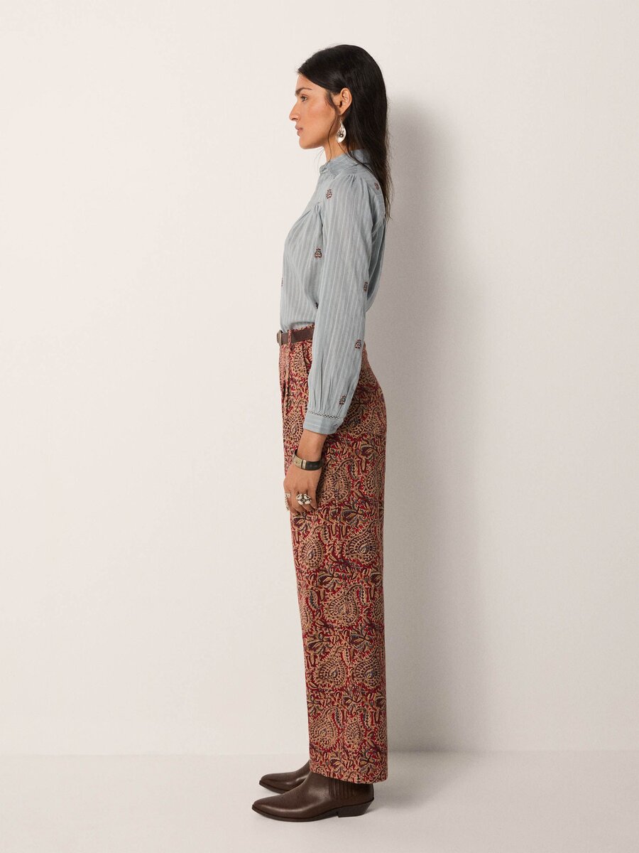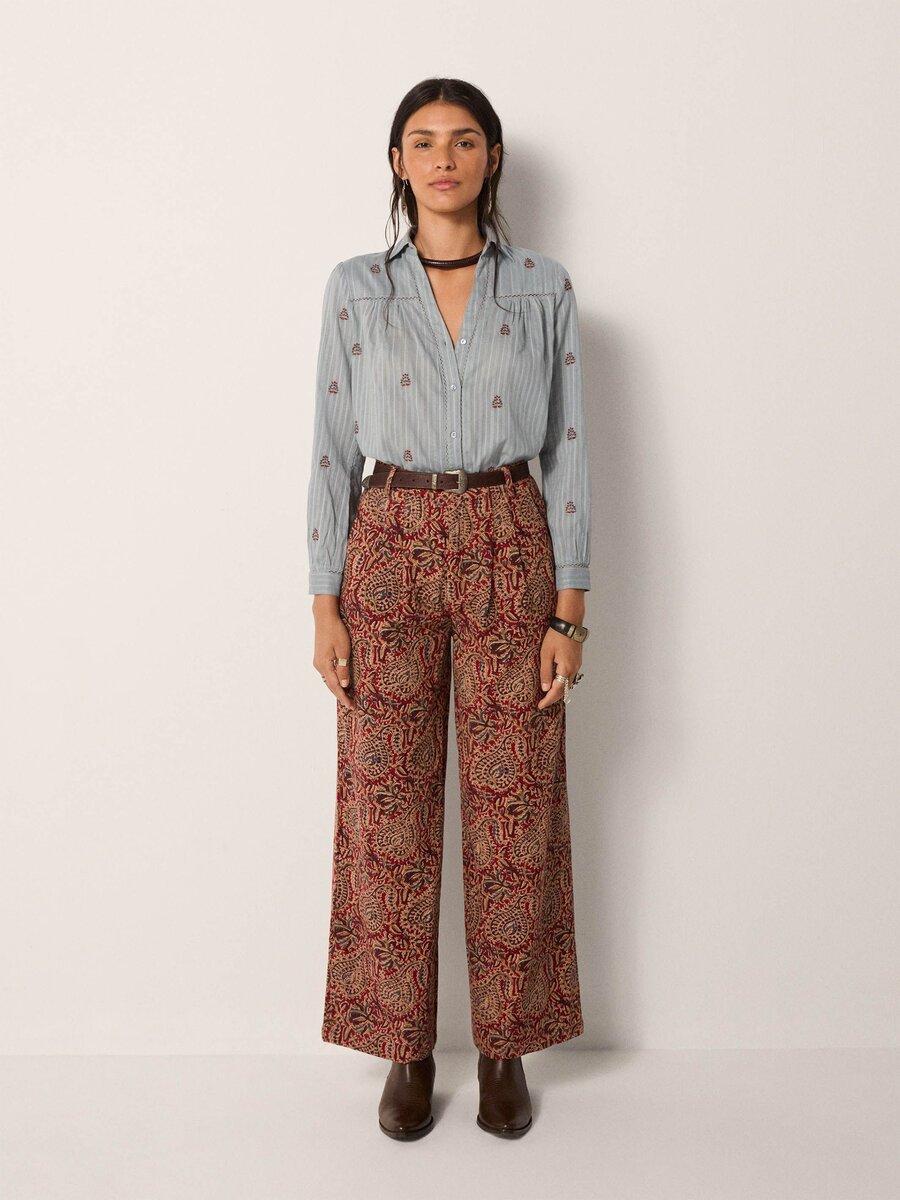 החולצה מעוטרת ברקמות קטנות ורב־צבעוניות הפזורות על הבד, המוסיפות לה נגיעה אמנותית ועדינה.