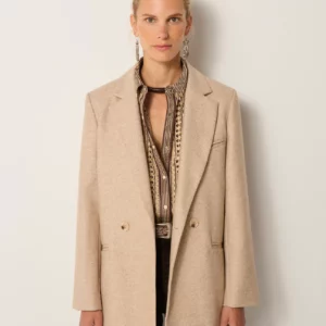 בלייזר מחויט מתערובת צמר רכה, בגוון בז’ נייטרלי עם חמימות עדינה.