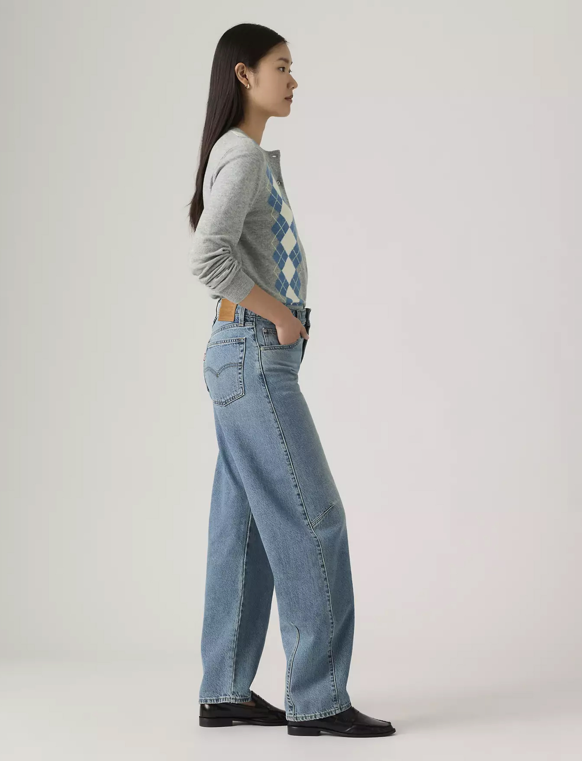 ג’ינס Baggy Dad Barrel עם רגל מעוקלת שהפכה לטרנד קבוע.