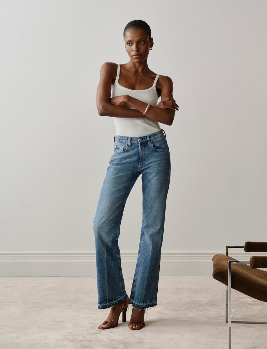 ג’ינס בגזרה ישרה ועל־זמנית, עם מותן בינונית ורגל ארוכה ונשפכת.