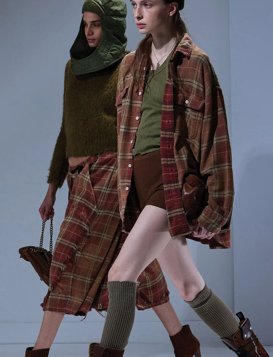 חולצה בגזרת אוברסייז מבית R13 בגווני אדמה. הבד בעל מרקם נעים ונפילה טבעית, מה שנותן לחולצה מראה חי ואותנטי.