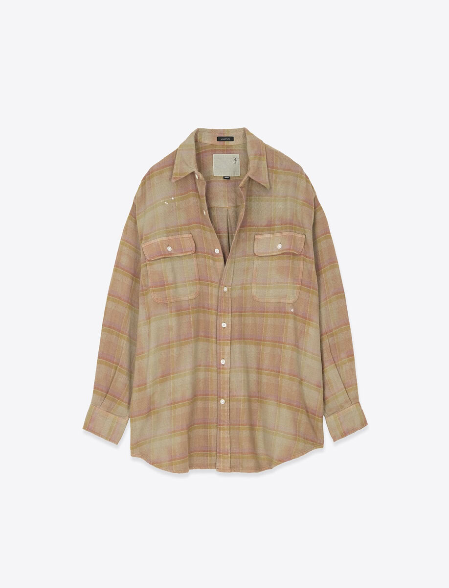 חולצה בגזרה משוחררת מבית R13 בגווני אדמה. הבד בעל מרקם נעים ונפילה טבעית, מה שנותן לחולצה מראה חי ואותנטי.