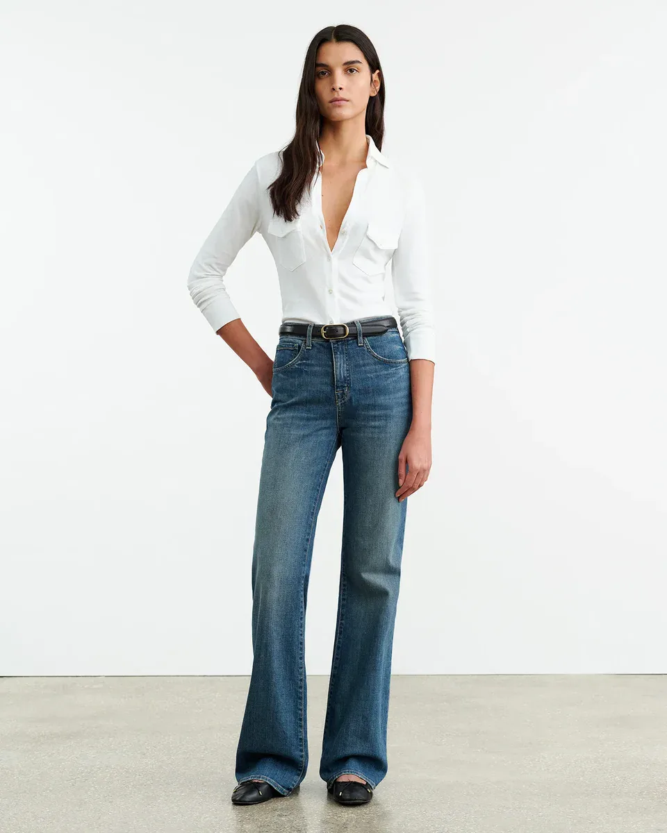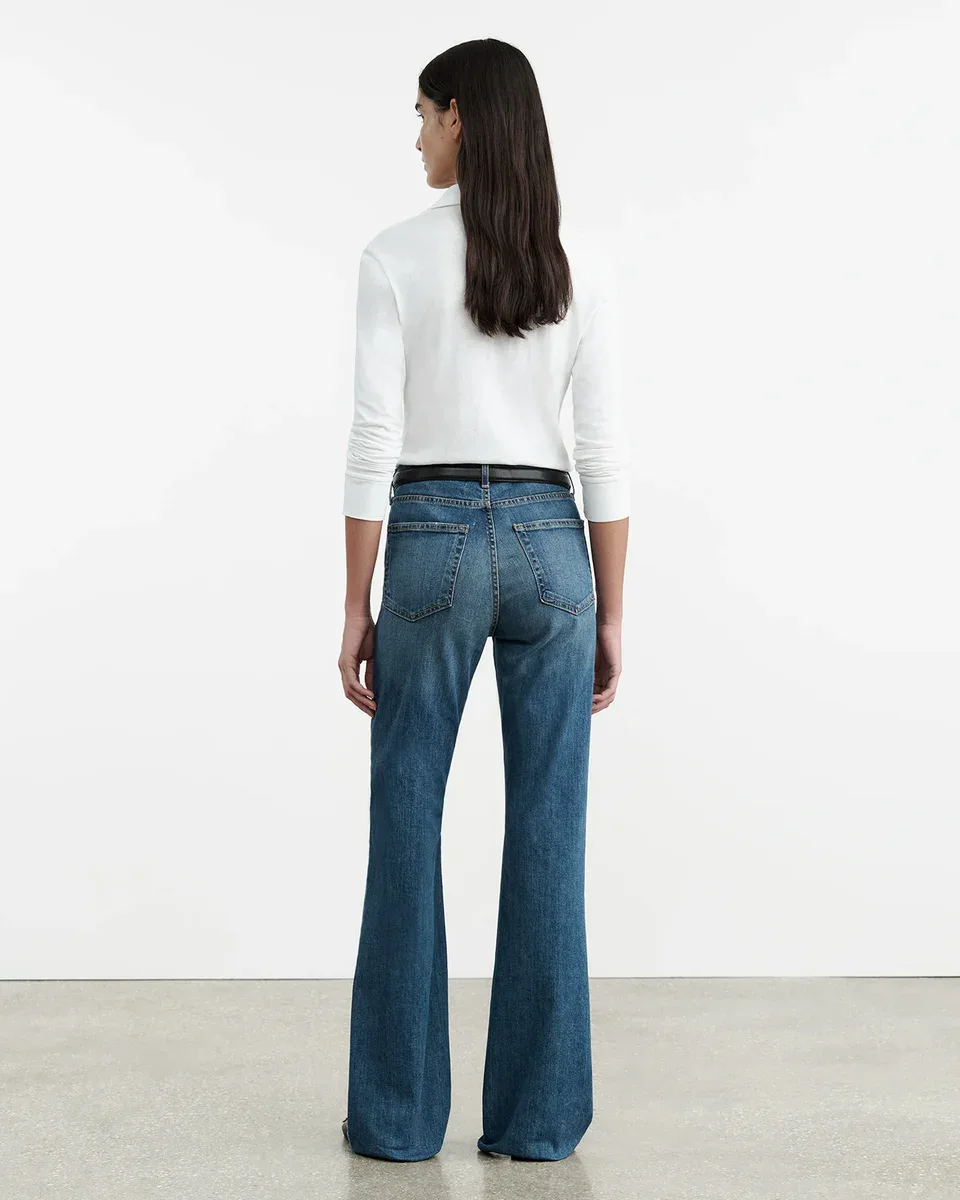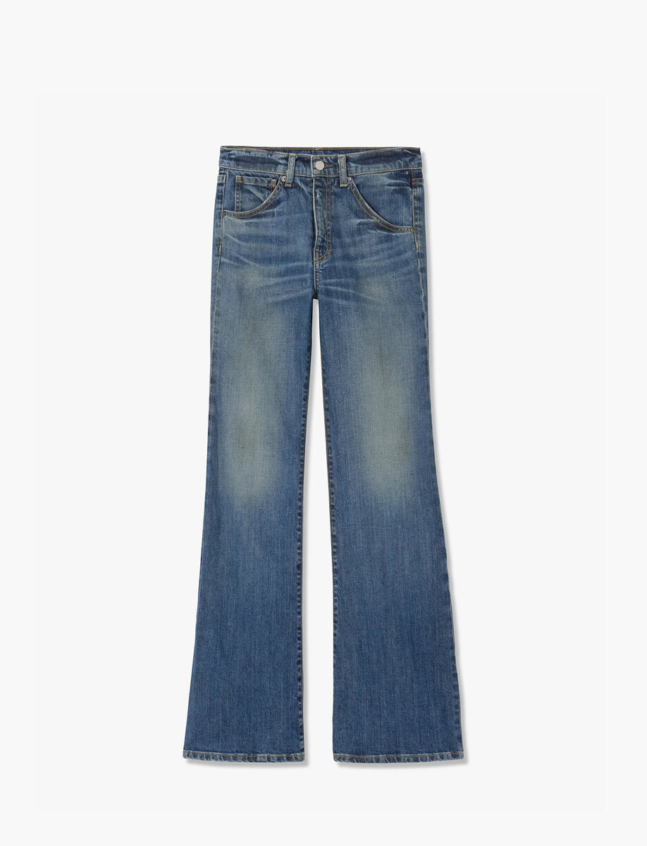 Mid-rise flare leg jean in Japanese stretch denim. Five pocket details. Zip fly. Shank closure. Belt loops.