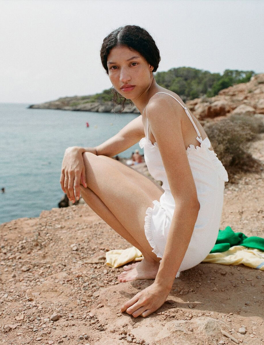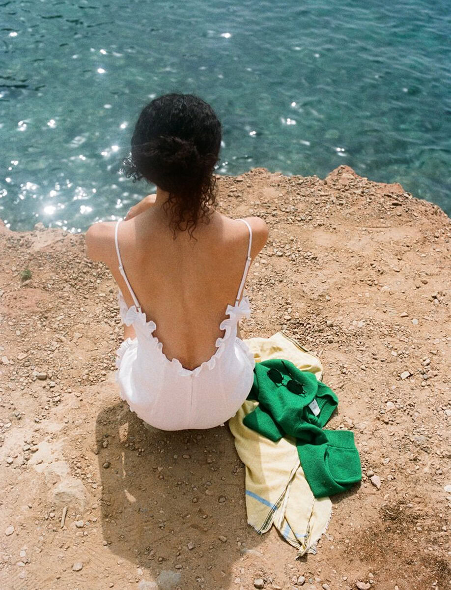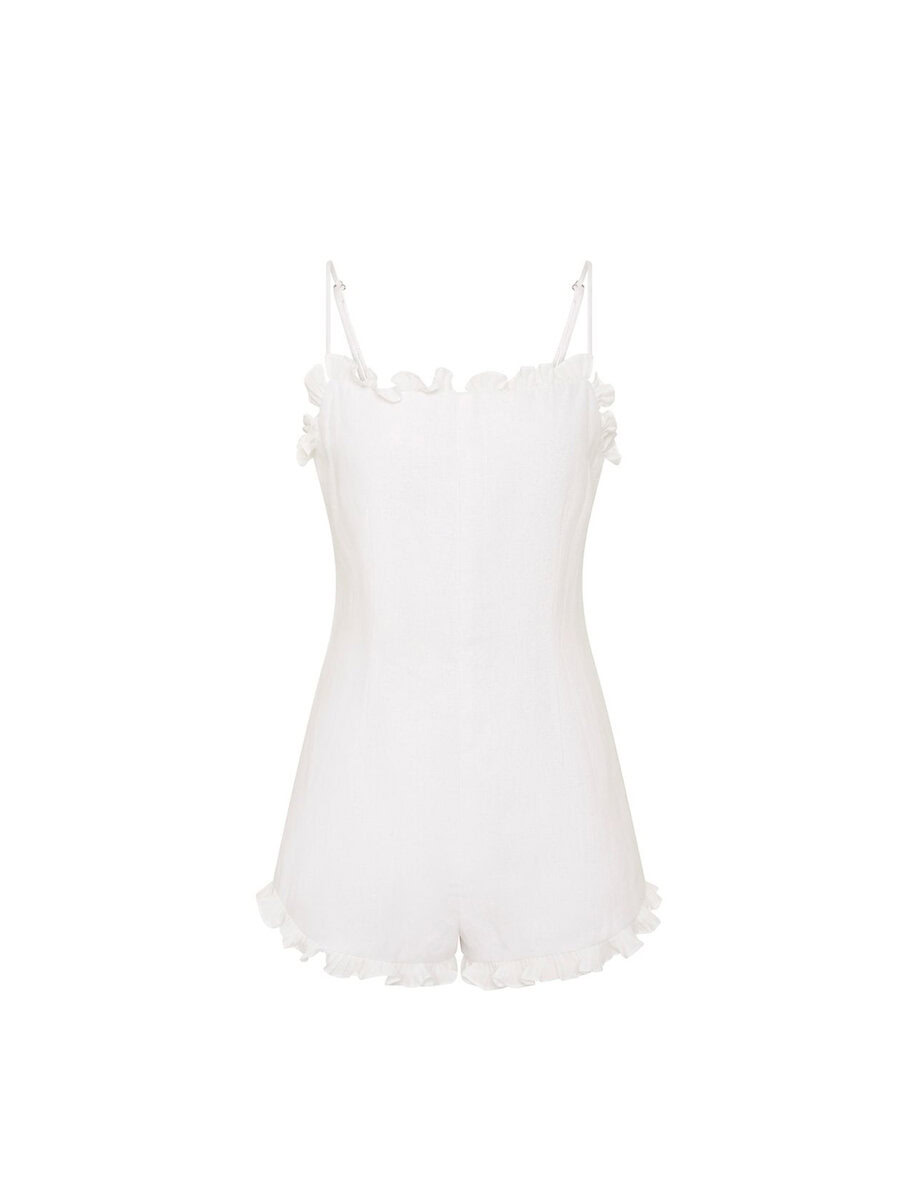 Crafted in premium linen, our Florence Romper features a deep scooped back, accented with delicate ruffle detailing at the neckline and hems and includes adjustable spaghetti straps for effortless wear.