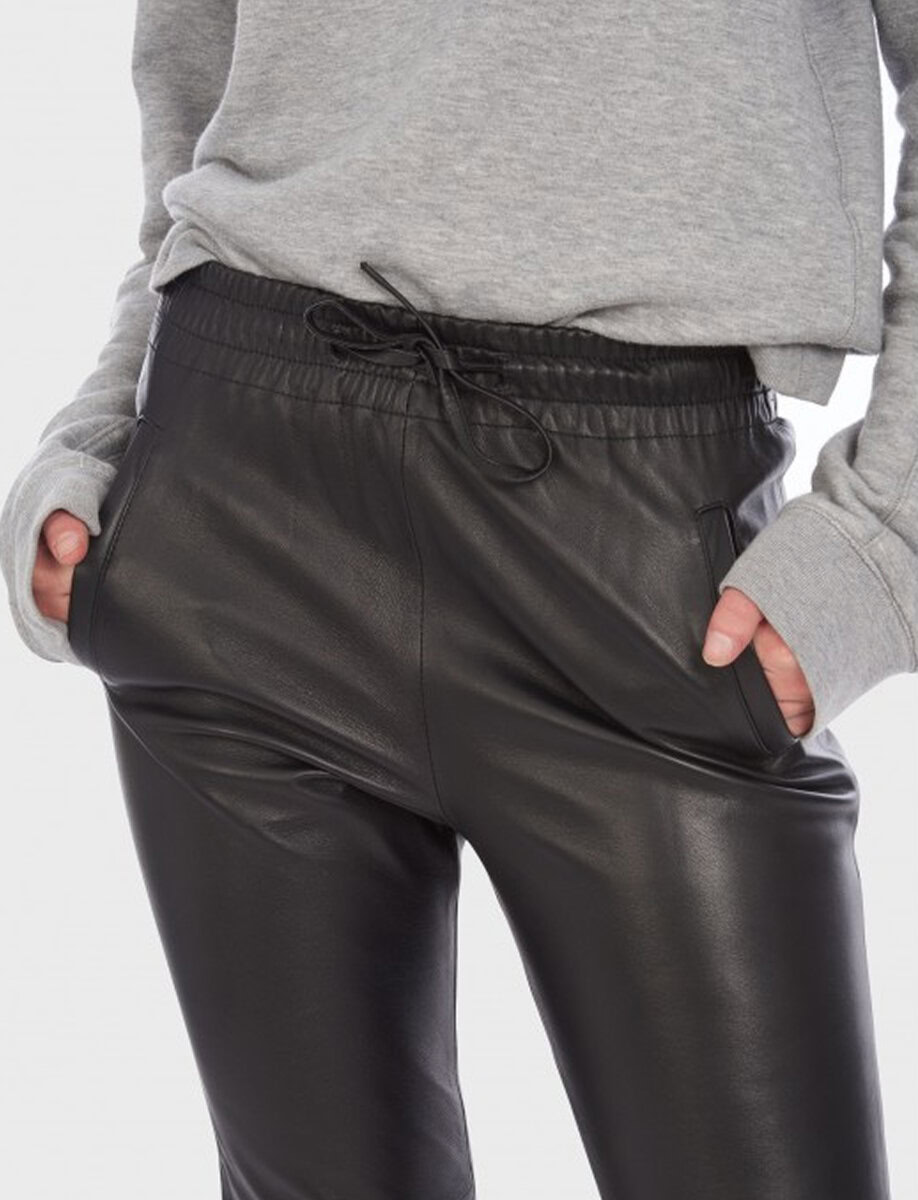 Part of the very current athleisure trend, these genuine sheep leather joggers are the asset to go out for urban and trendy looks! Soft and fine genuine leather, comfort fit, 7/8 lenght with raw cut edge, elastic waist with drawstring, side pockets at the front, decorative pockets at the back. Without lining.