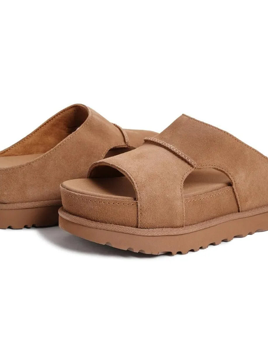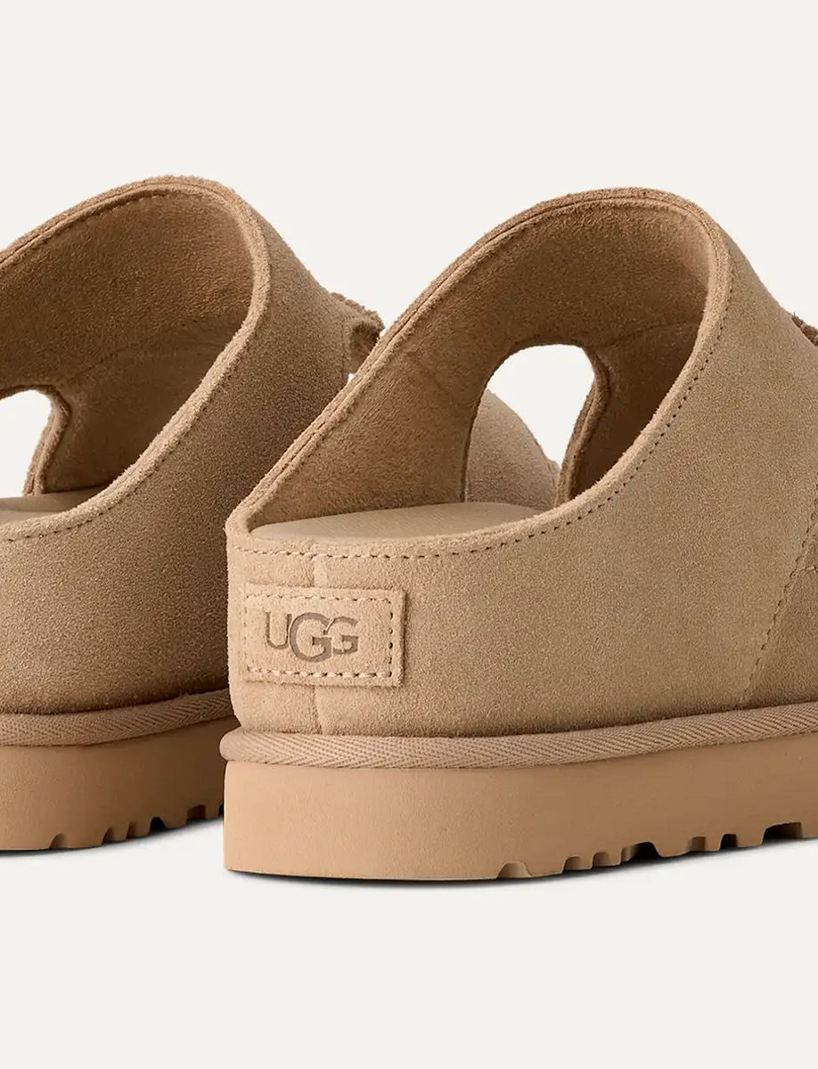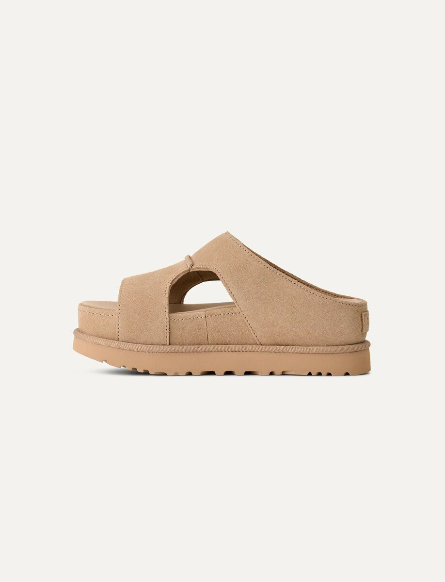 Hi, we’re new here. Our Goldenstar Hi Cutout Slide originates from our best-selling Goldenstar Hi Sandal, now in an easy slip-on-and-go slide. Crafted with side cutouts, this slide has a minimalist, architectural feel that makes an ideal companion to your summer style. Packed with premium details, it’s made from velvety suede and features a cushy, supportive foam footbed, and a lightweight sugarcane EVA outsole for all-day wear. Padded Twin Seam detailing adds that little extra something to this simple, but special, slide.