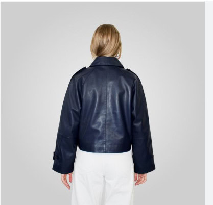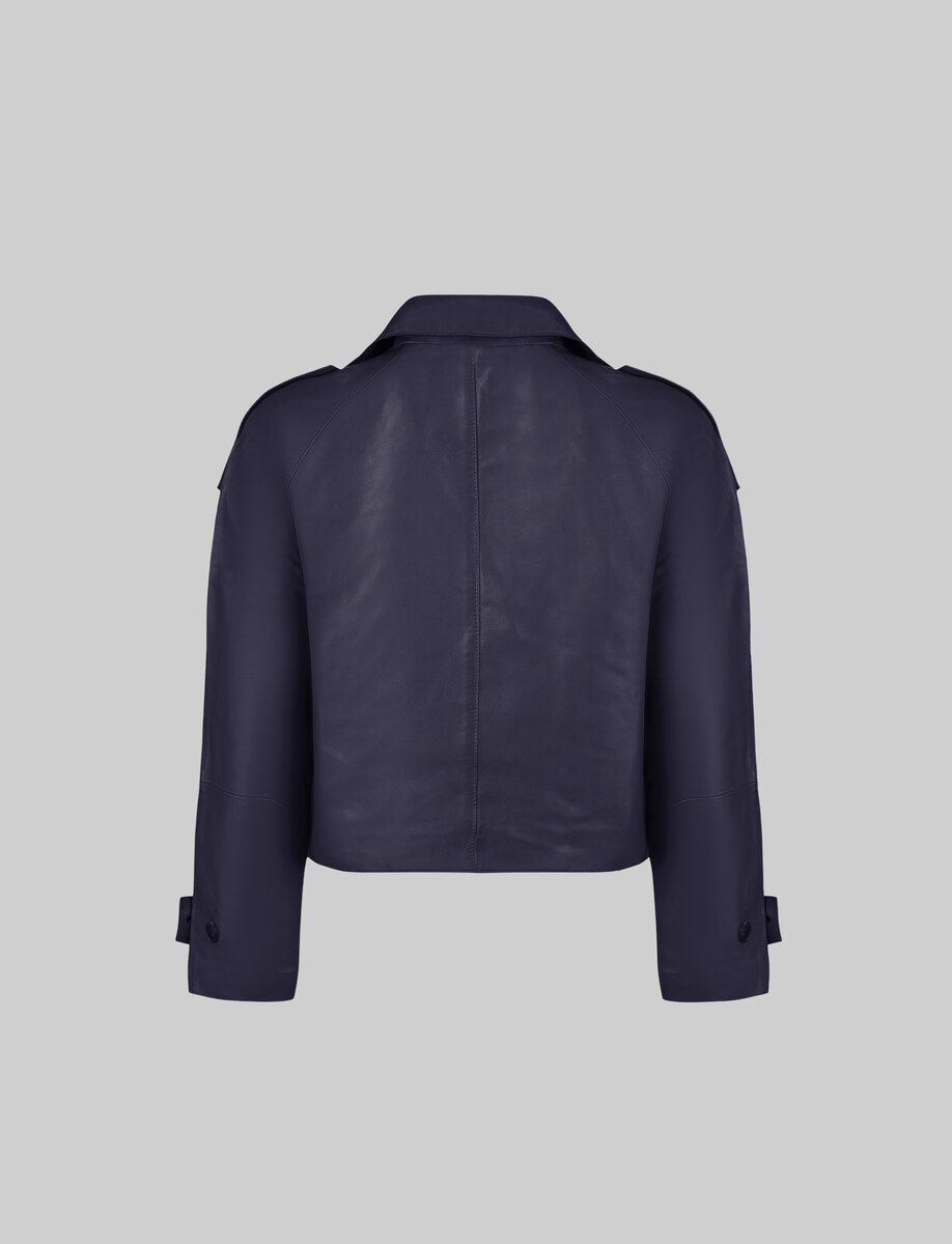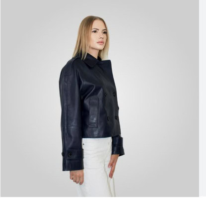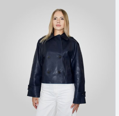 The HANNA is a cropped leather jacket with a clean double-breasted front. It features wide lapels shoulder tabs and buttoned cuffs for a smart structured look. Great for adding a touch of modern style to any outfit.