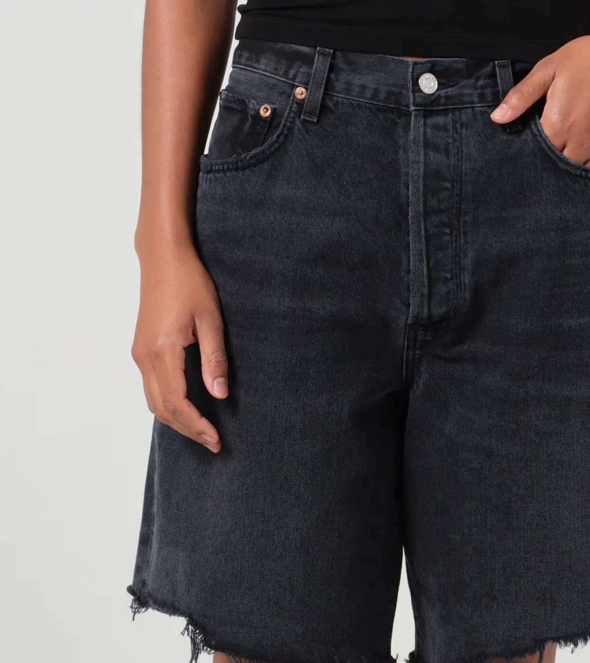 Crafted from regenerative cotton, these washed-out black denim shorts showcase fading, whiskering, and a raw hem for a lived-in, vintage appeal. Pair with a sleek fitted top and sandals for a laid-back, off-duty look, or style with an oversized shirt and sneakers for an elevated, weekend-ready ensemble.