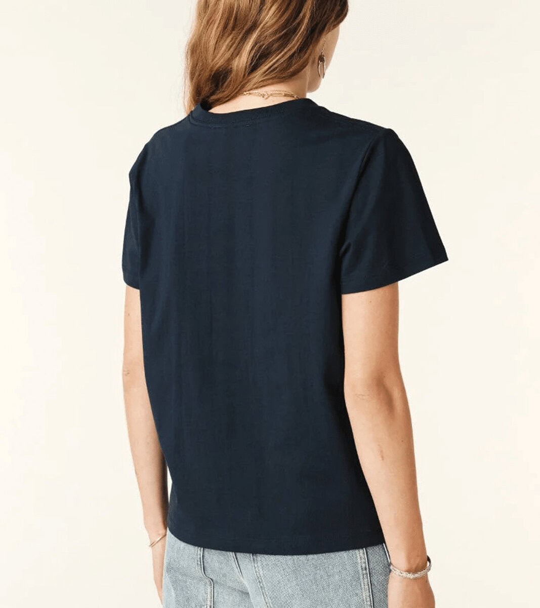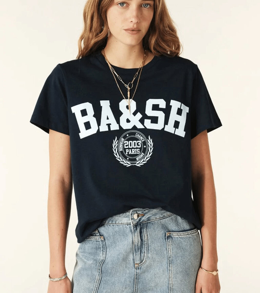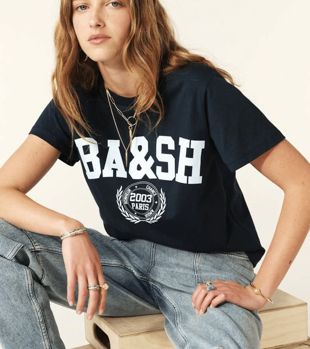מתנוסס לוגו BA&SH גדול בשחור בעיצוב קולג’י שמוסיף טאץ’ וינטג’ אורבני ומלא סטייל.
