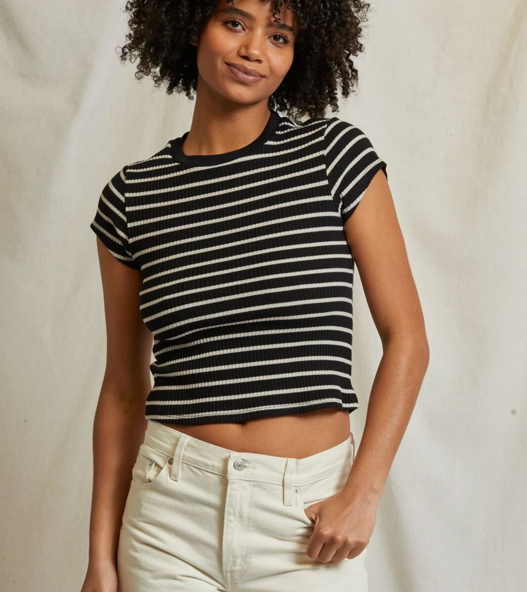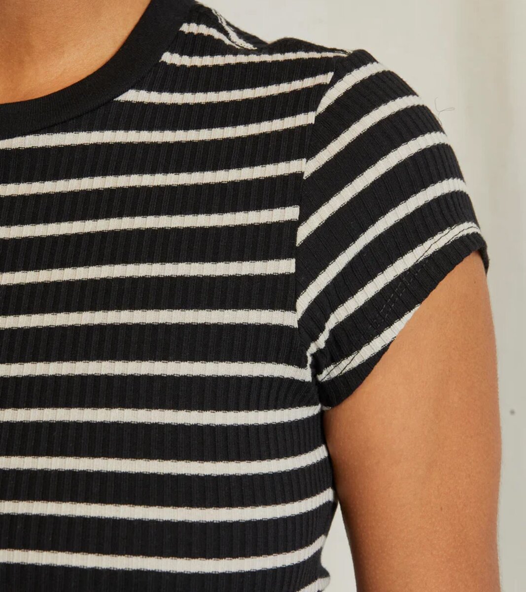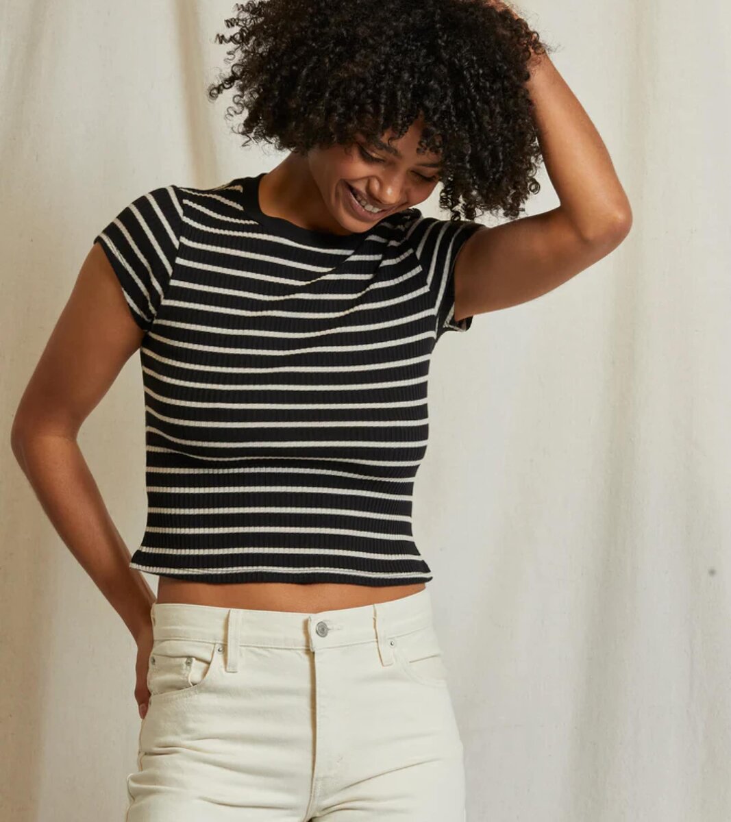 fitted baby tee inspired by the sicilian seaside. cut from our signature cotton spandex and features a shrunken silhouette and contrasted neckline.