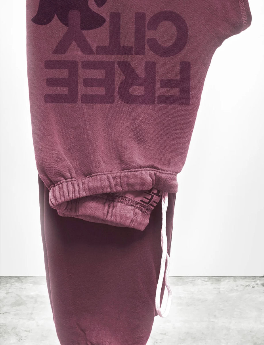 Unisex FLOW sweatpant in hunkydory with classic “FREECITY” print in deep orange and tonal light orange “FREECITYDOVE,” covered elastic waist and pull drawcord.
