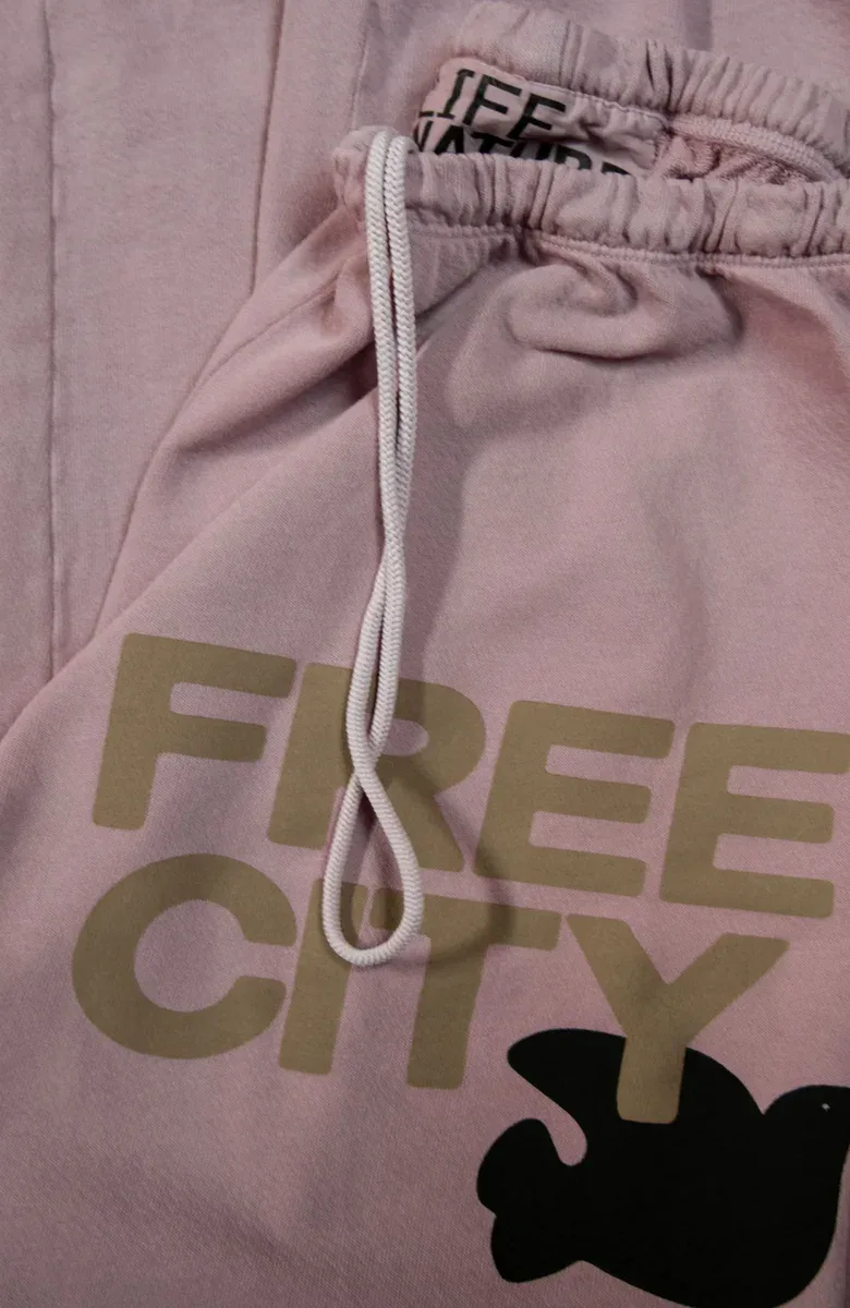 Unisex FLOW sweatpant in hunkydory with classic “FREECITY” print in deep orange and tonal light orange “FREECITYDOVE,” covered elastic waist and pull drawcord.