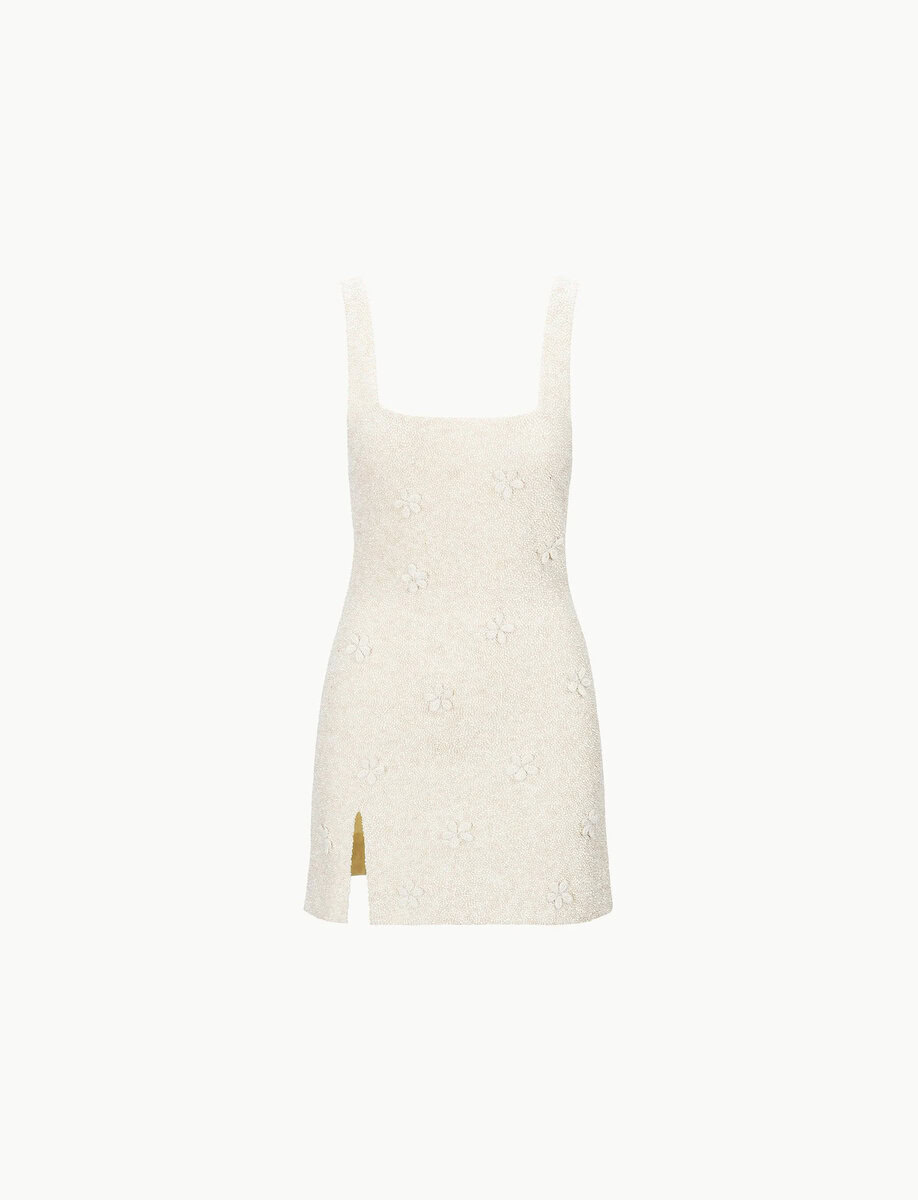 Our best-selling beaded mini dress has been updated in a three dimensional floral for the Spring season. The Le Sable is a fully hand-beaded dress with a square neckline and a side slit.