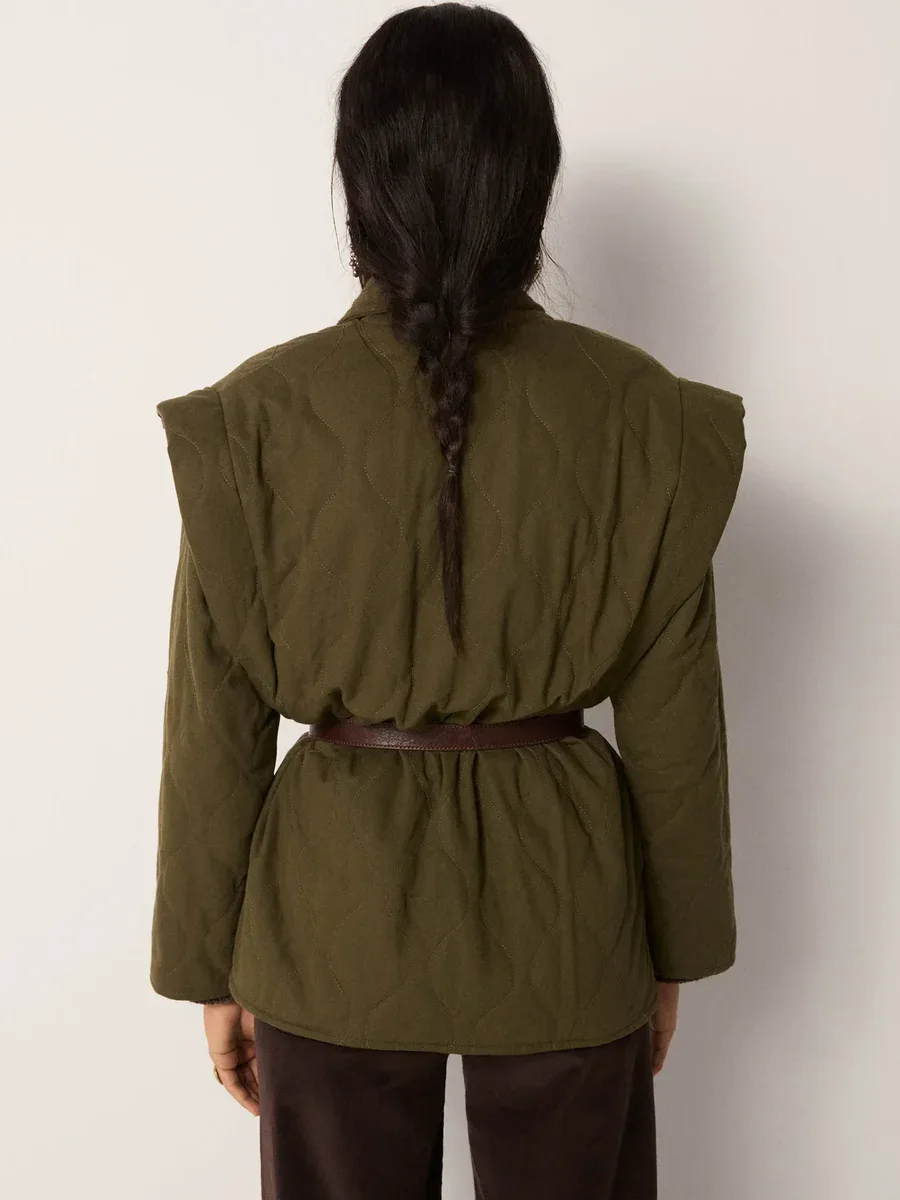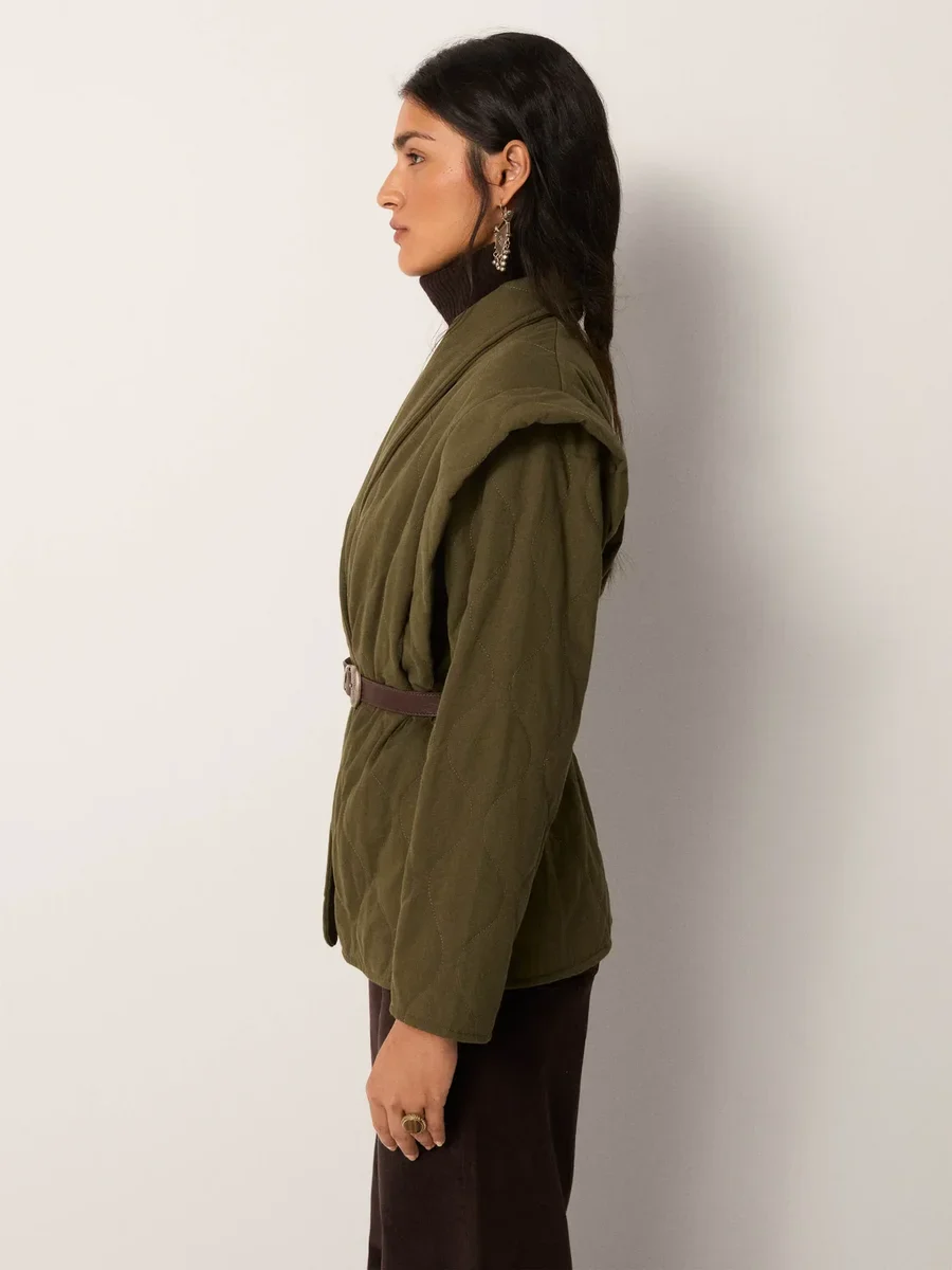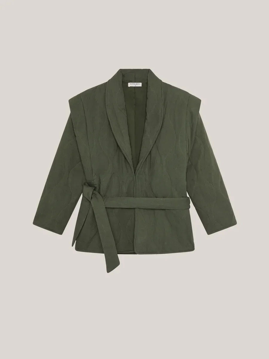 Quilted cotton-tencel blend, lightly padded jacket with natural softness. The olive ground sits between moss and earth.