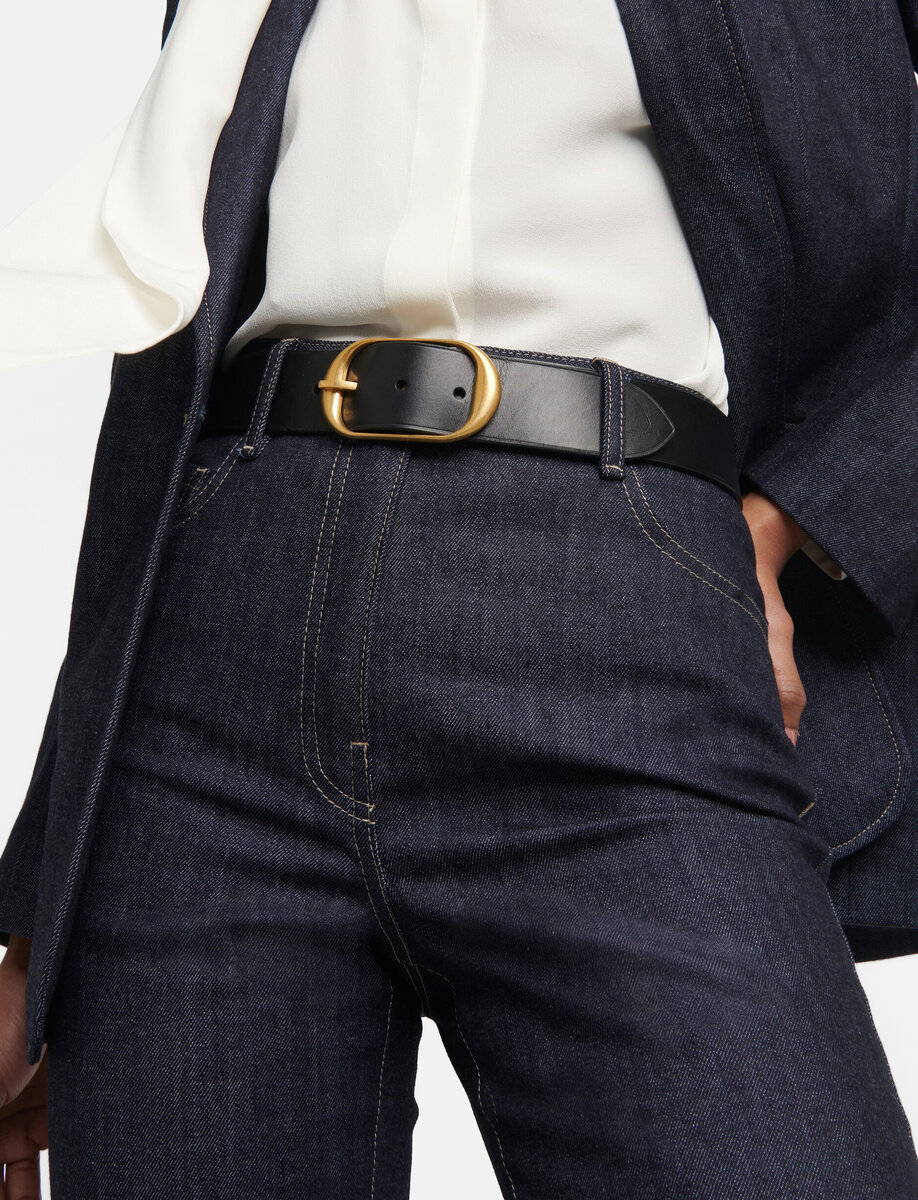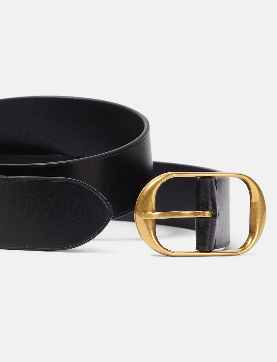 Wide belt in cowhide leather. Solid antique brass buckle in matte gold finish. Contoured to fit around the natural shape of the waist.