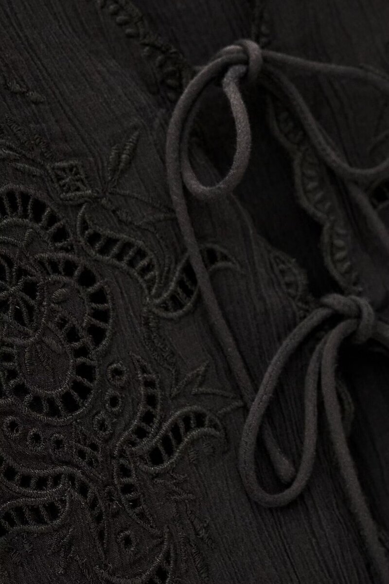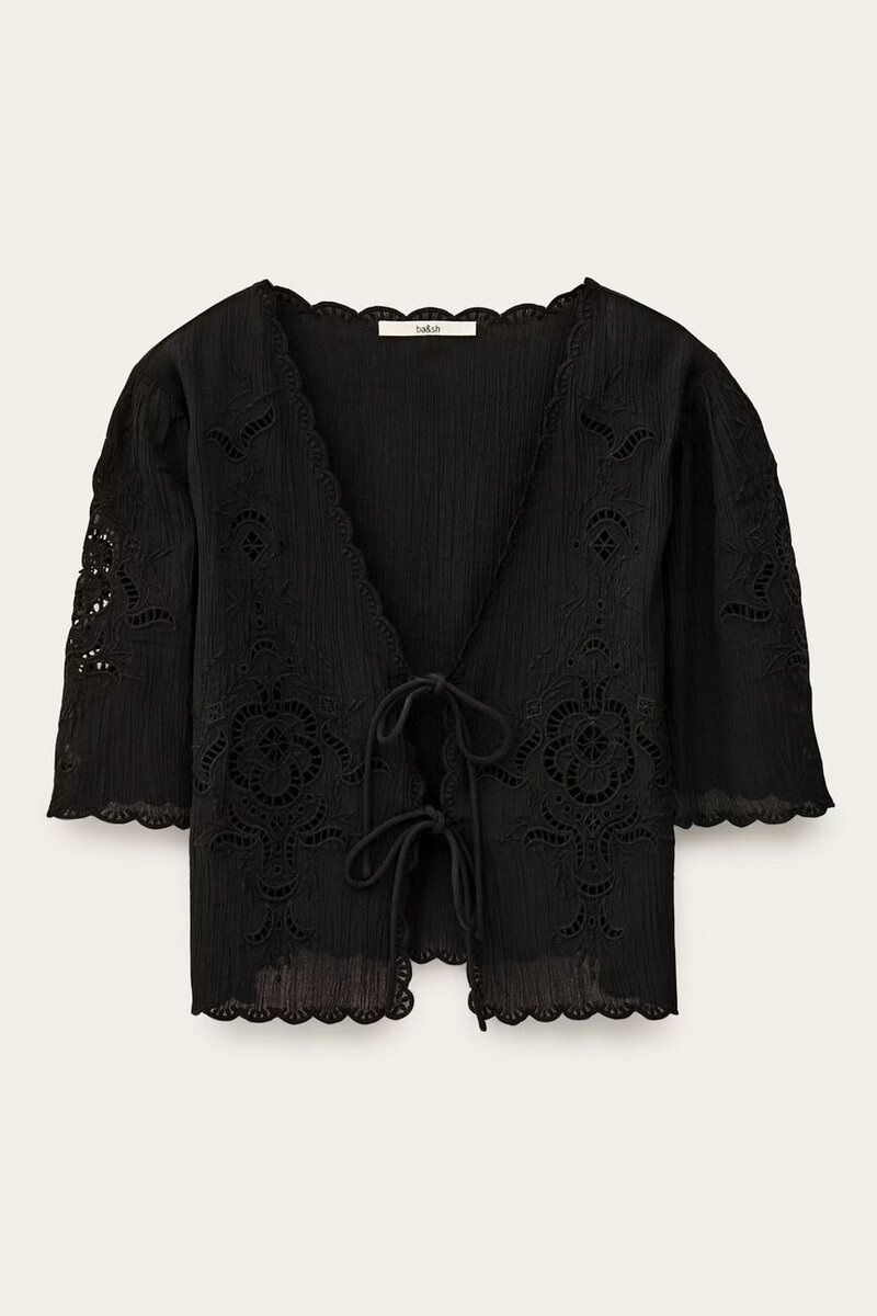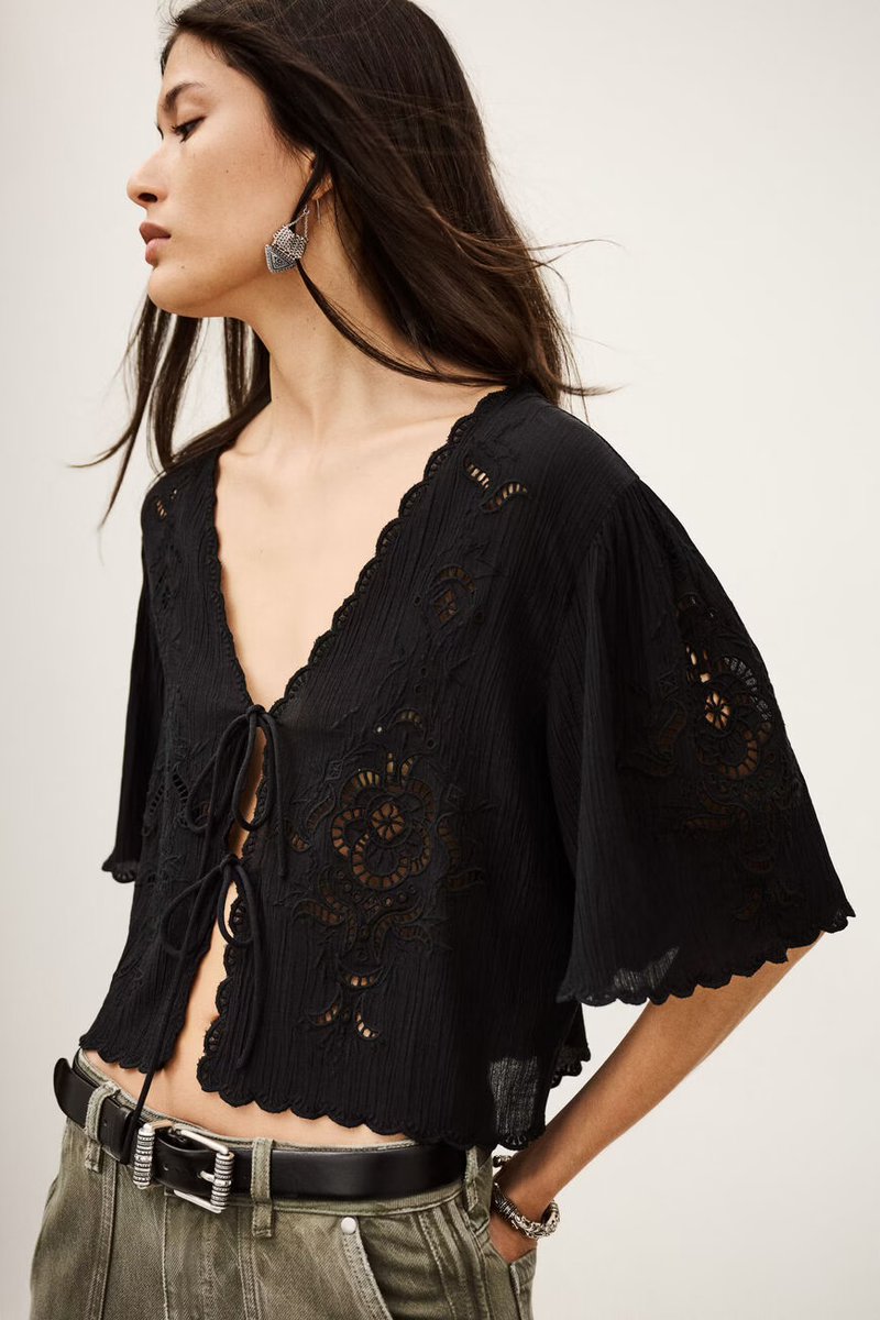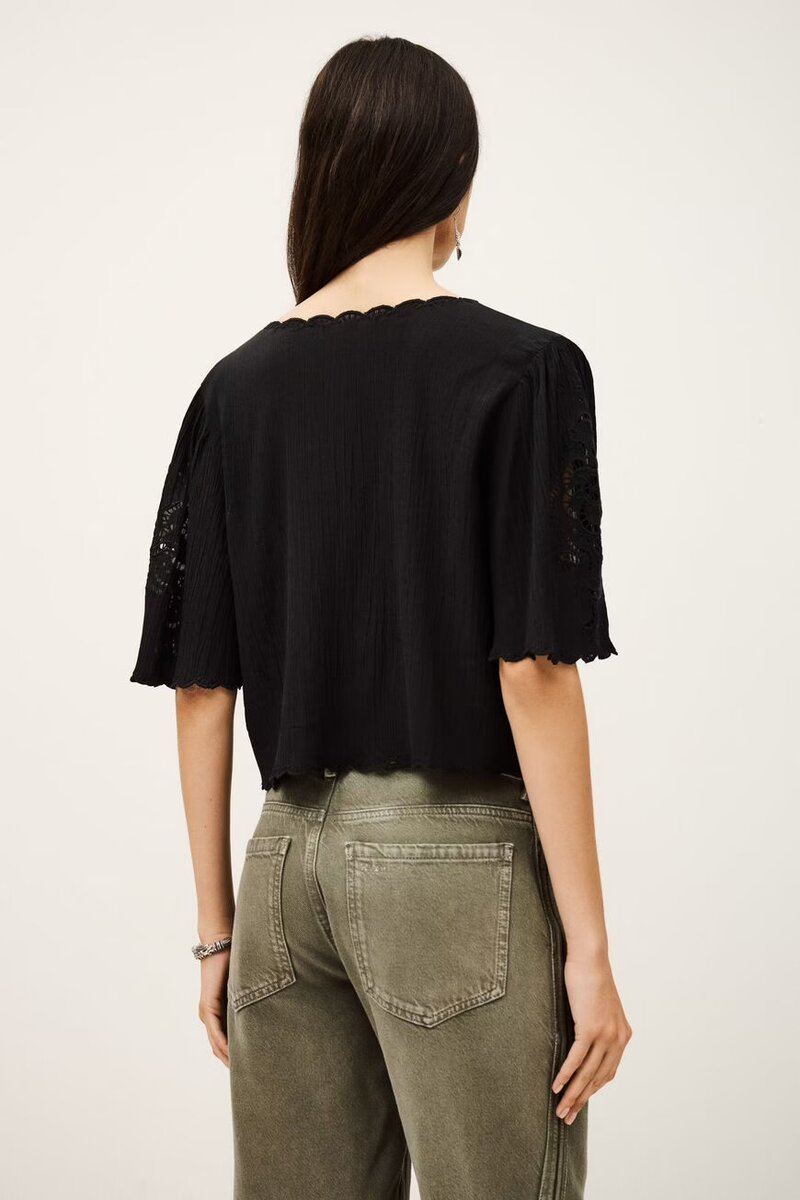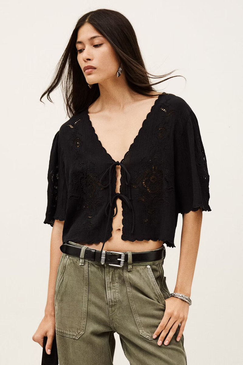 חולצה לבנה רומנטית בגזרת קרופ קלילה, עשויה בד רקום עם דוגמאות לייזר-קאט עדינות. בעלת מפתח V נשי עם שרוולים קצרים מתרחבים וסיומות בגל עגול. נסגרת בקשירות עדינות מלפנים שמוסיפות טאץ’ נשי ואוורירי.