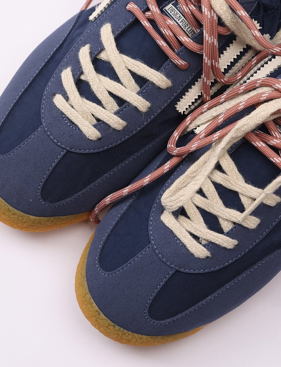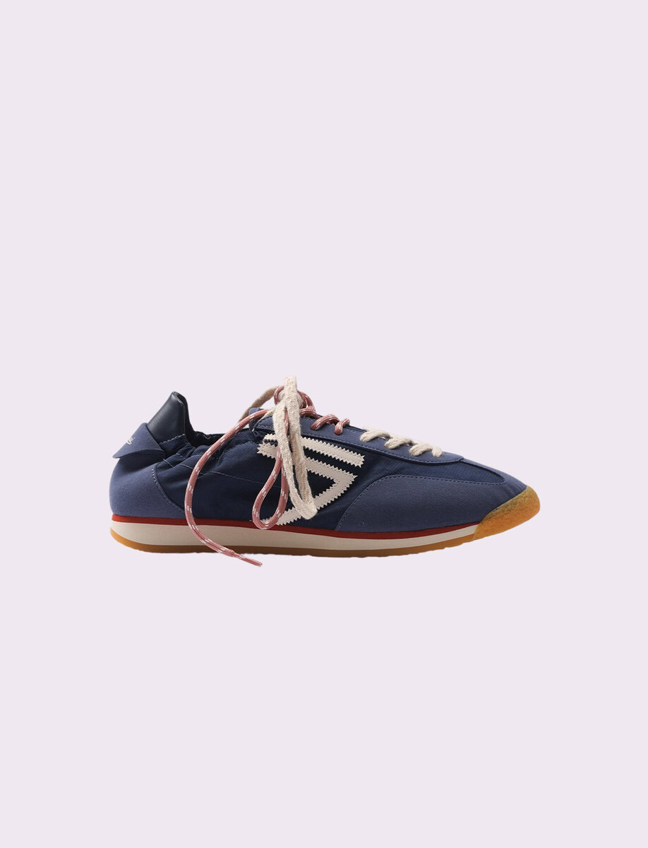 שילוב קלאסי של ניילון וכותנה מיקרו-זמש בכחול נייבי, עם לוגו בגוון אוף-וויט ונגיעות כחול נייבי שמדגישות את העיצוב.