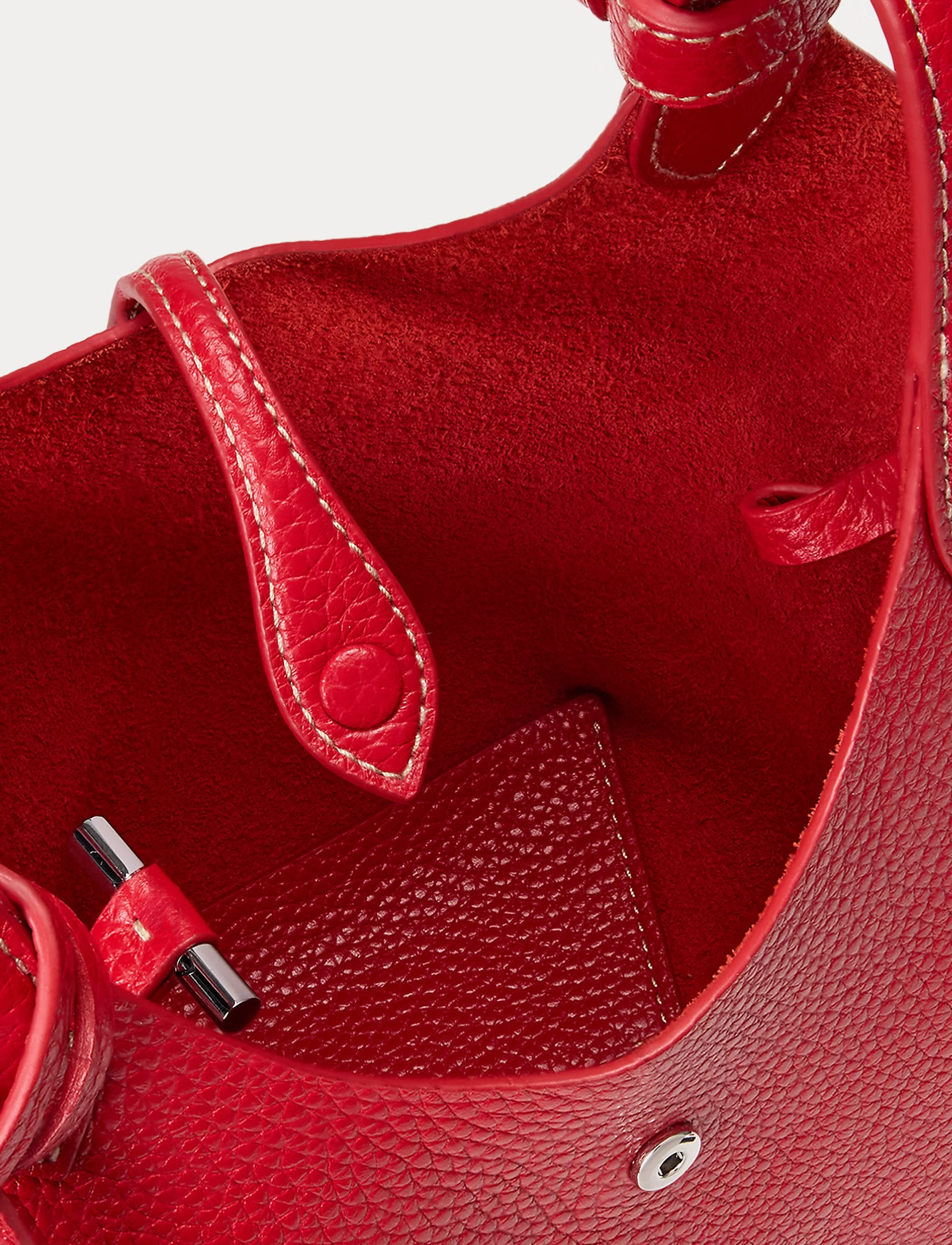 Exterior snapped leather tab on the top opening. Interior metal T-bar secures with a leather loop, which cinches the bag.