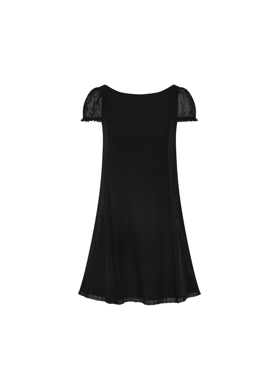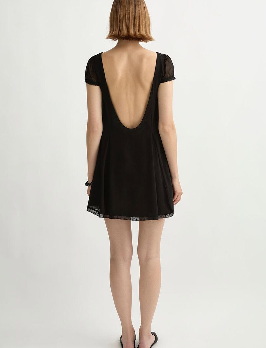 שמלה קצרה וקלאסית בצבע שחור, בעיצוב מינימליסטי ונקי עם נגיעה רומנטית.