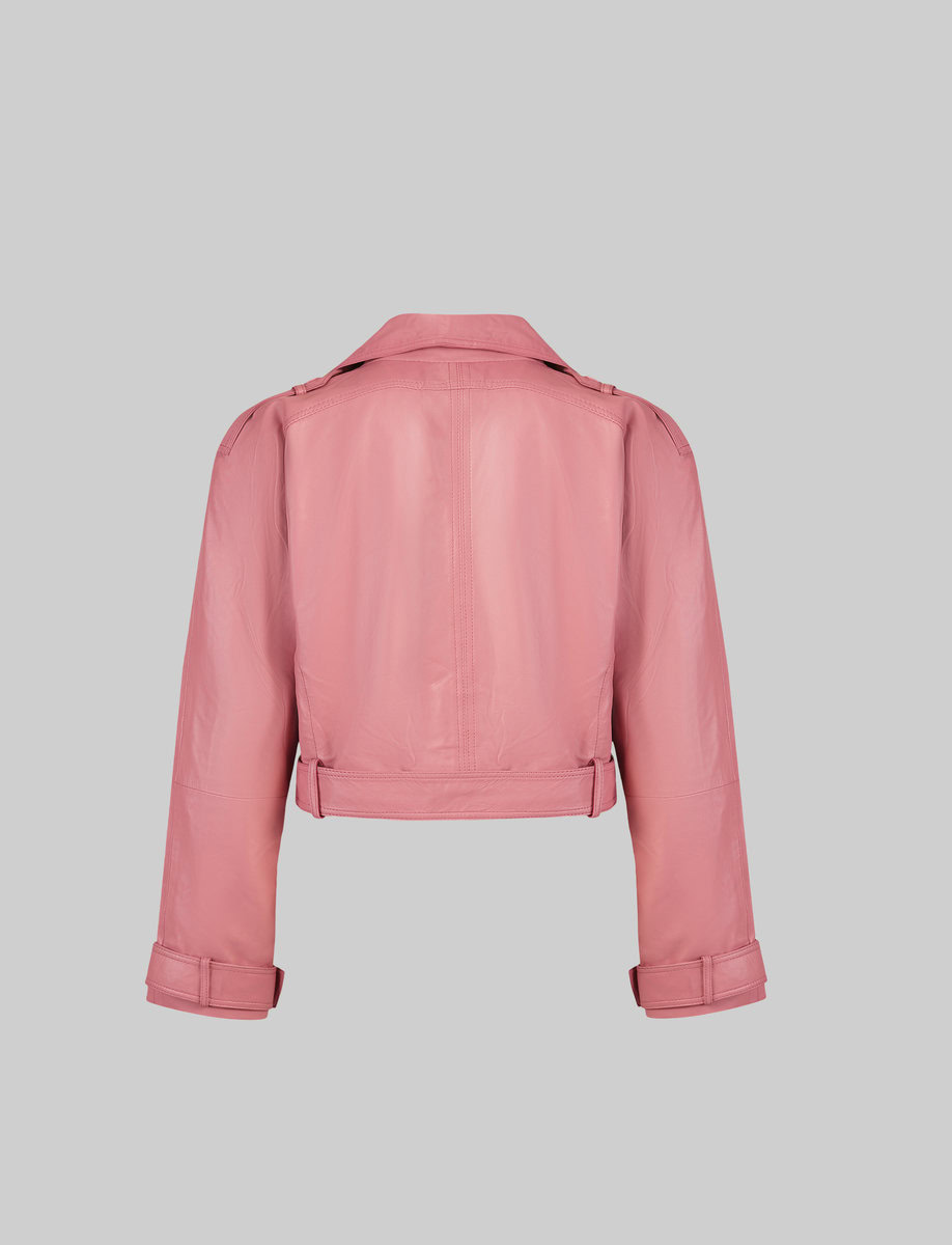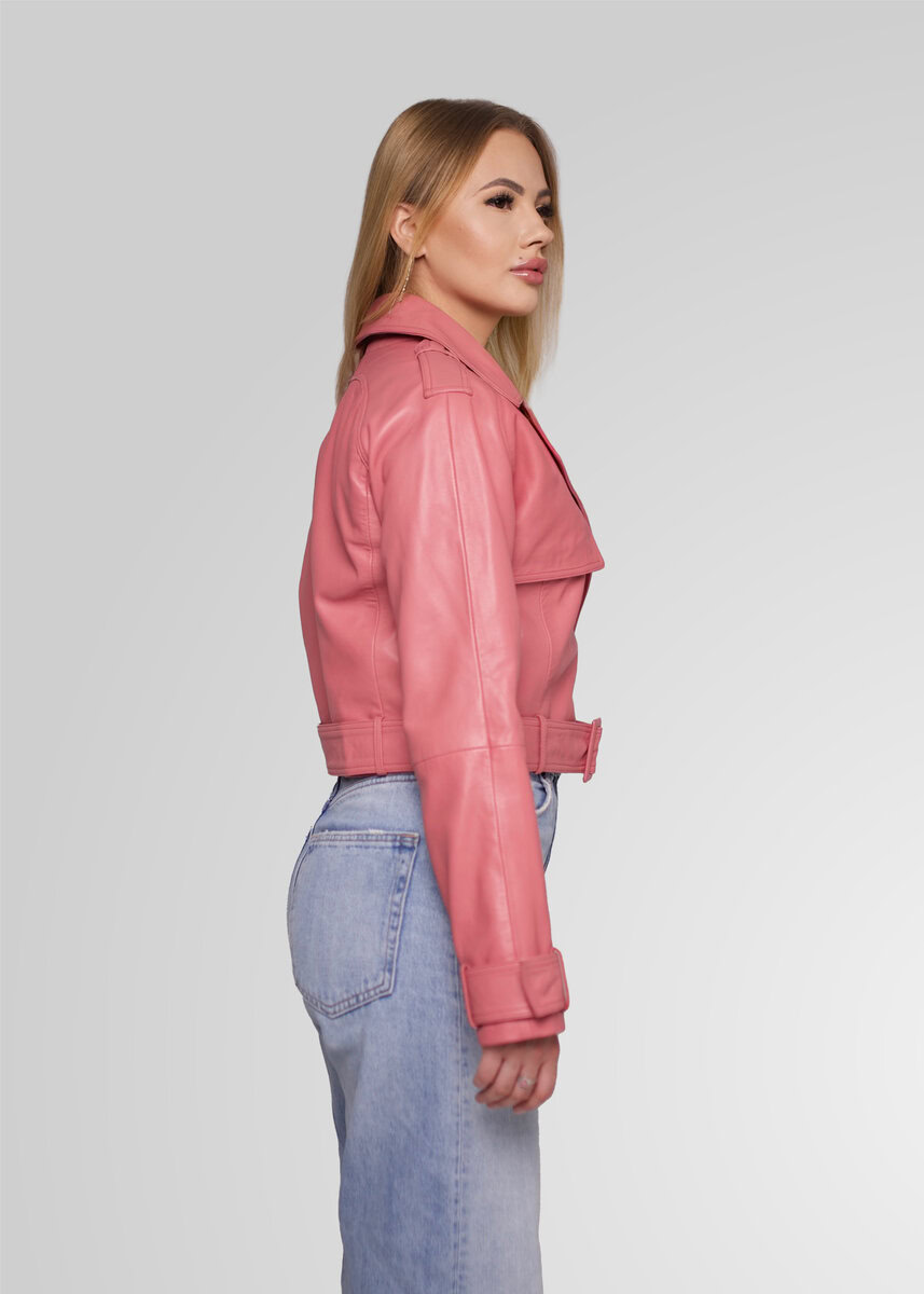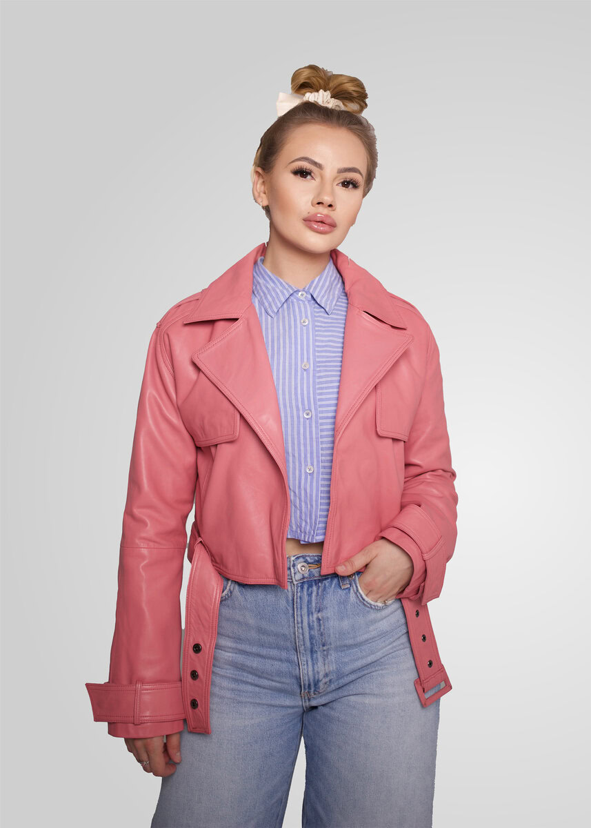 The ROMIE jacket has a modern cropped design with a structured shape. It features a wide collar flap pockets and a matching belt to define the waist. Finished with clean lines and cuffed sleeves this piece brings a fresh stylish edge to any outfit.
