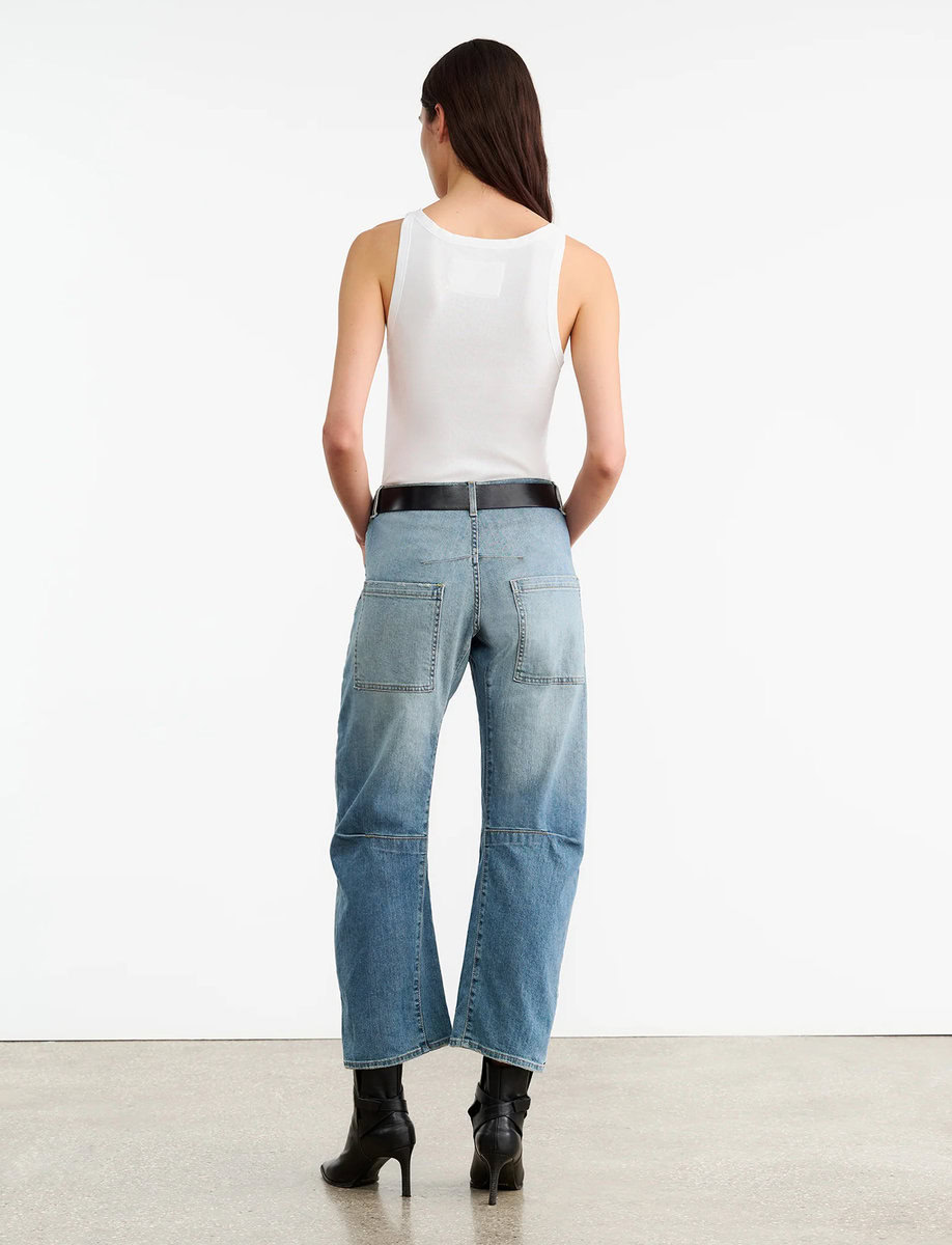 Mid-rise, relaxed fit barrel leg jean in Japanese stretch denim. Uniquely curved silhouette. Seam detail at knees. Gusset at inseam. Zip fly. Shank closure. Top-stitched front and back patch pockets. Belt loops.