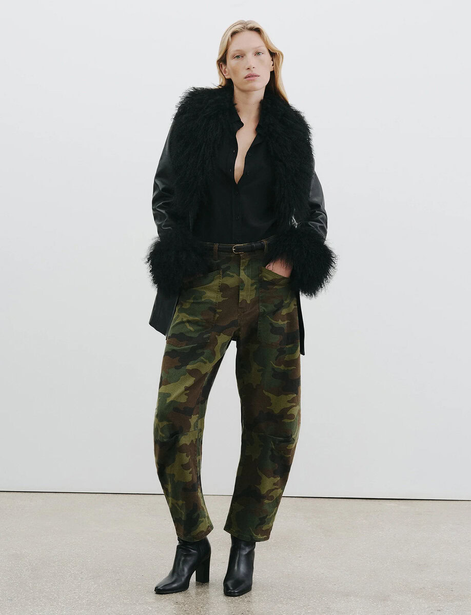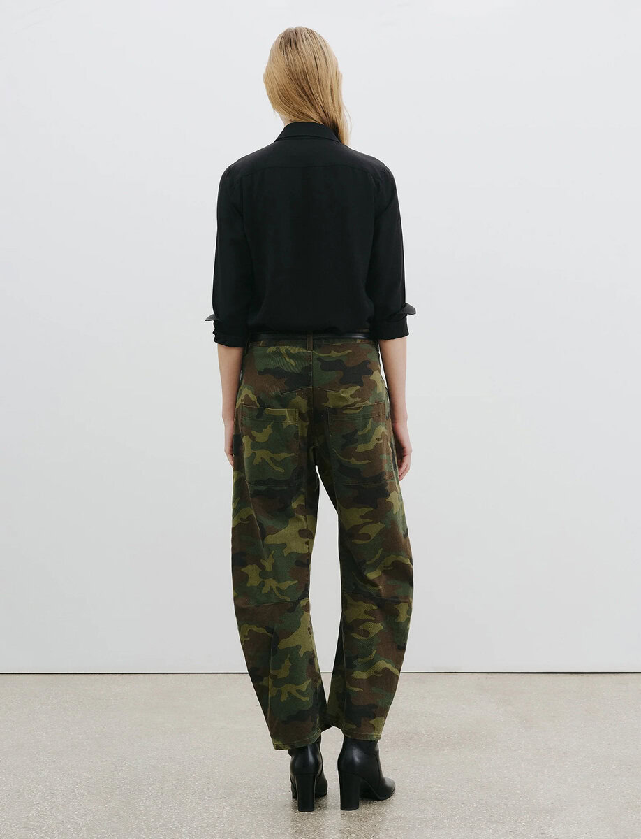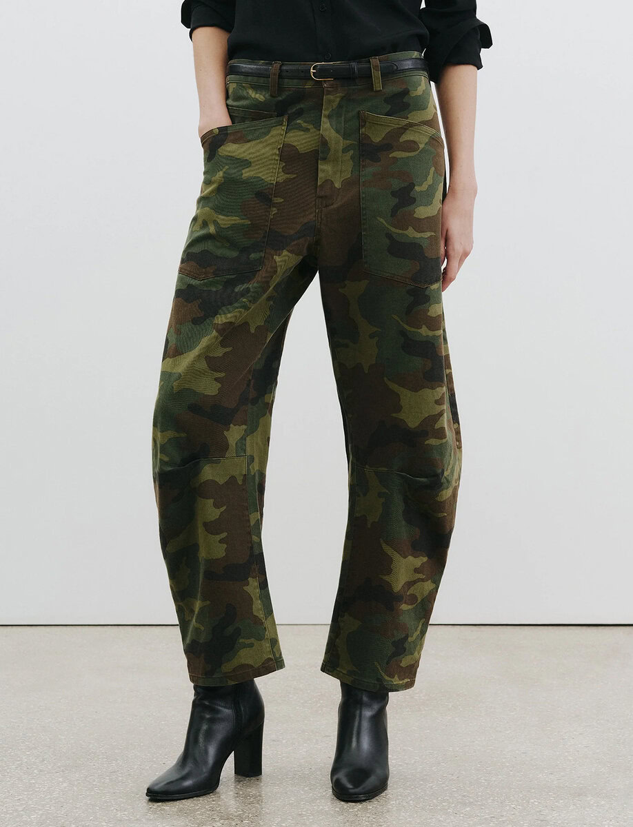 הדפס הקאמו מעניק למכנסיים אופי חזק וקר רוח, בעוד הפרטים המחויטים שומרים על מראה מדויק.