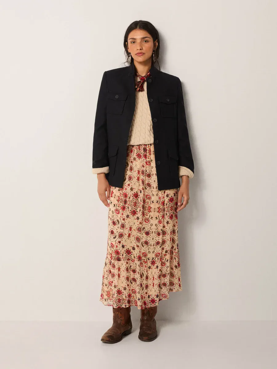 חצאית ויסקוזה קרפ רכה, מודפסת בפרחים פזורים במראה כמעט פולקלורי – פריחה אדומה ומוטיבים ארציים על רקע גיר בהיר דהוי.