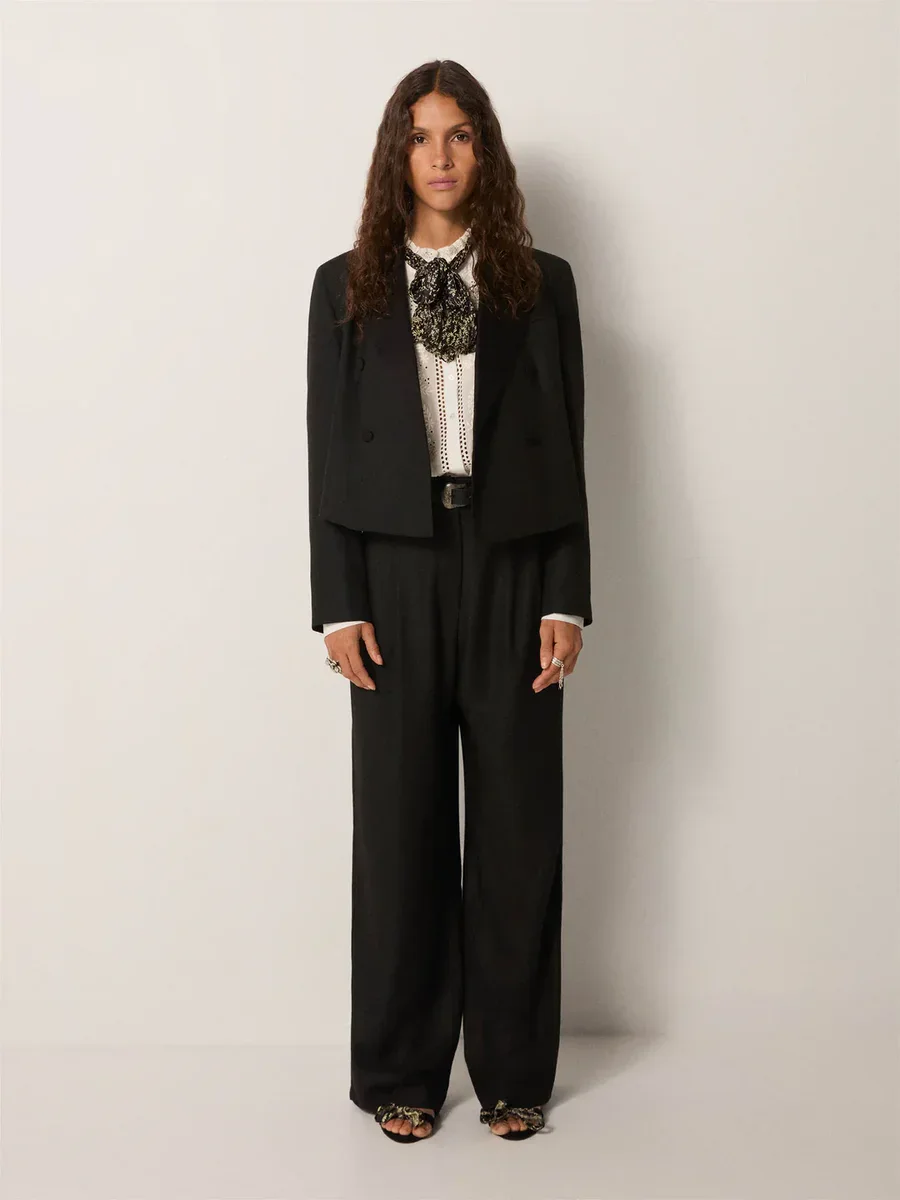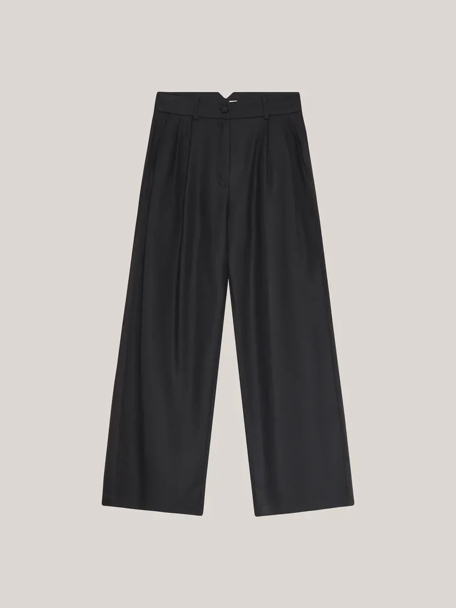 Viscose blend cut into a wide, straight leg with clean fall. High–waisted, with a flat waistband and subtle pleats that add movement without volume. The fabric has weight and drape, giving the silhouette an elongated line.