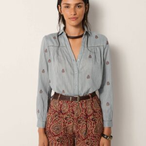 Soft cotton with a light hand forms the base of this blouse, striped in fine lines that carry subtle texture. Its relaxed fit feels effortless.