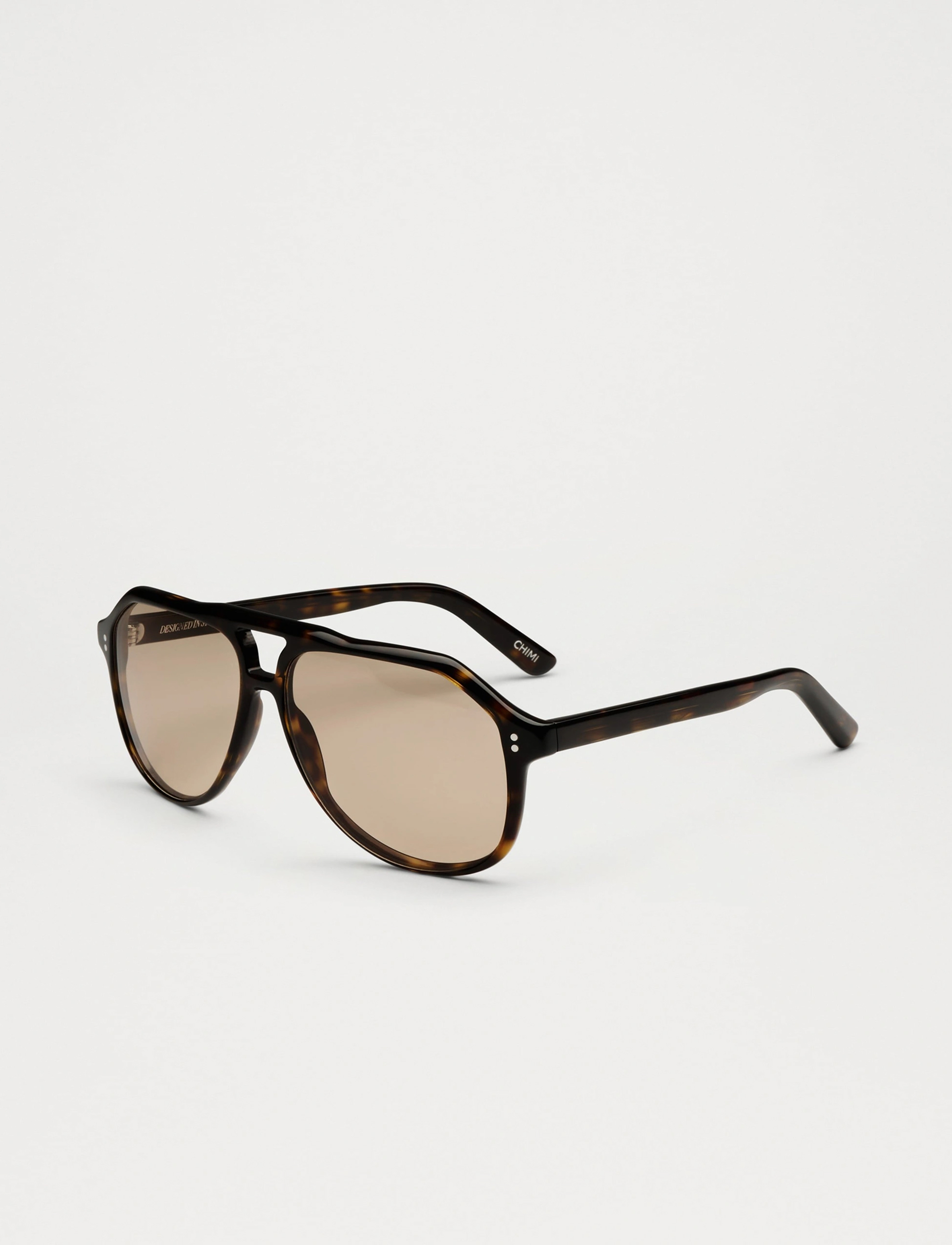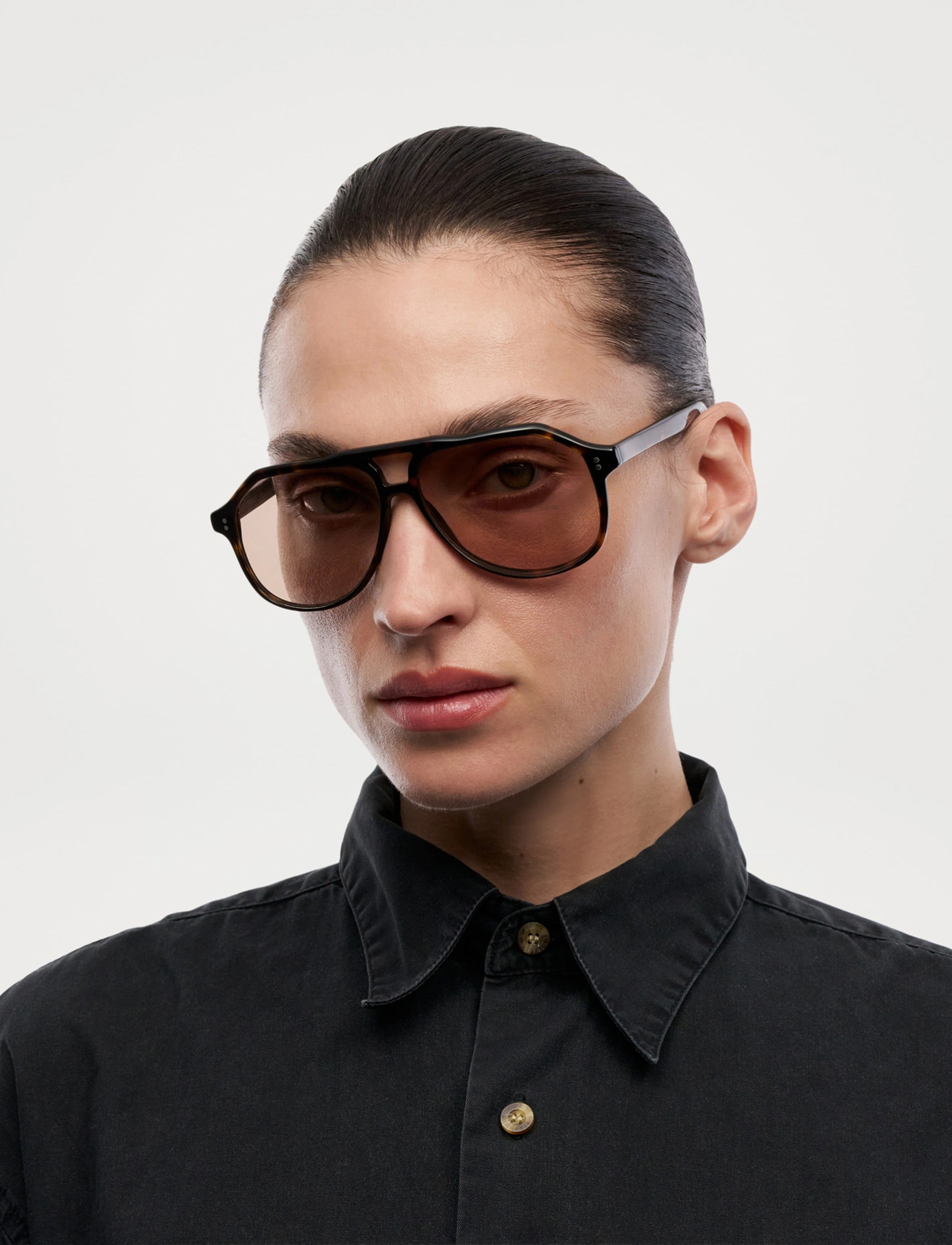 An aviator silhouette with structured contours and arched double bridge. Finished with custom made metal detailing characterized by our signature metal trim.