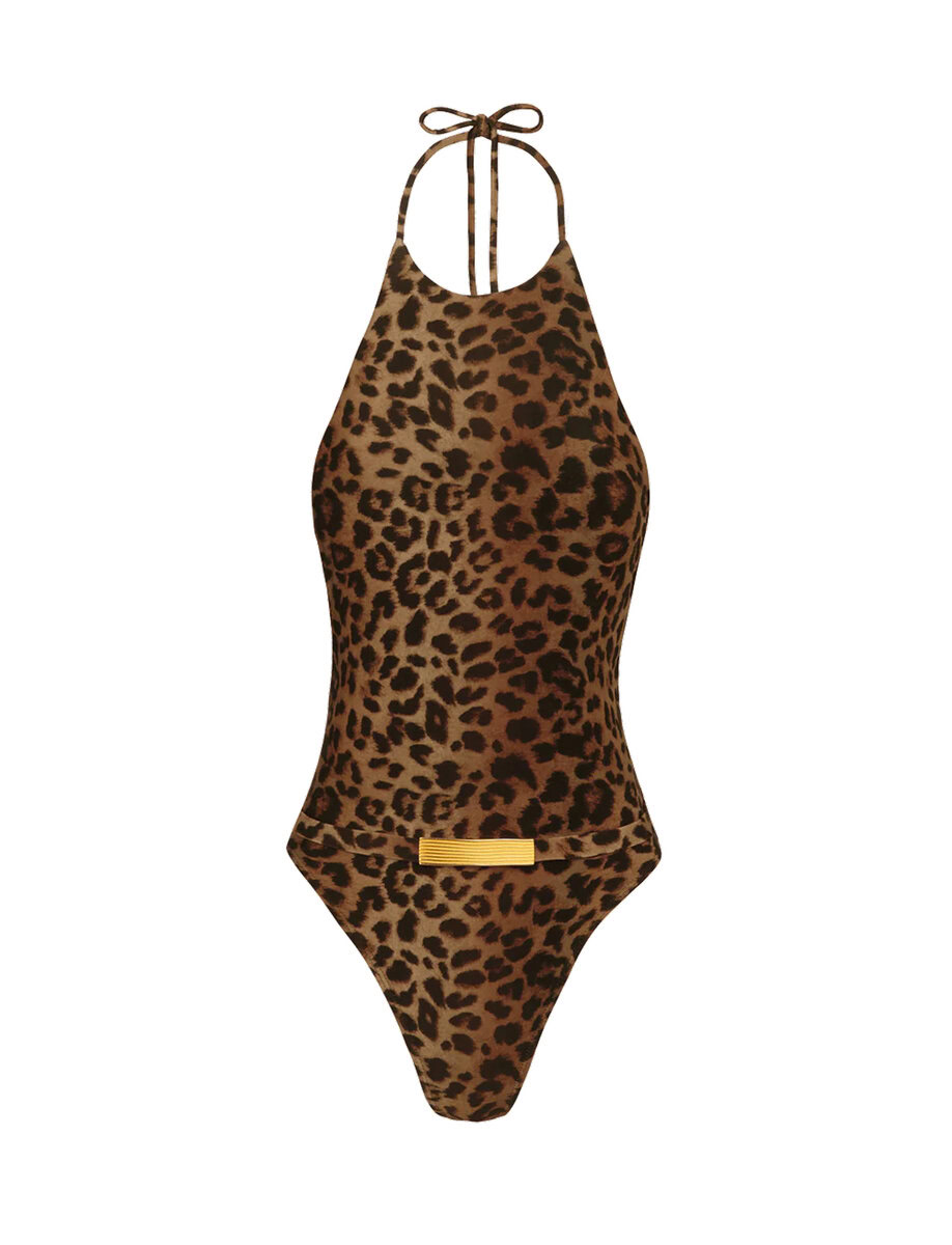 From the ViX + Rosie Huntington-Whiteley collaboration, the Tammy Renee One-Piece is a figure-flattering swimsuit featuring a high neckline, open back, and a belt-inspired front accented with a gold-plated detail, finished with tie closures at the neck.
