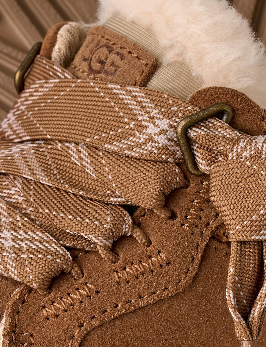 Webbing heel strap, The UGG® Logo patch, Padded collar, Oversized padded tongue, Fixed knots on lace