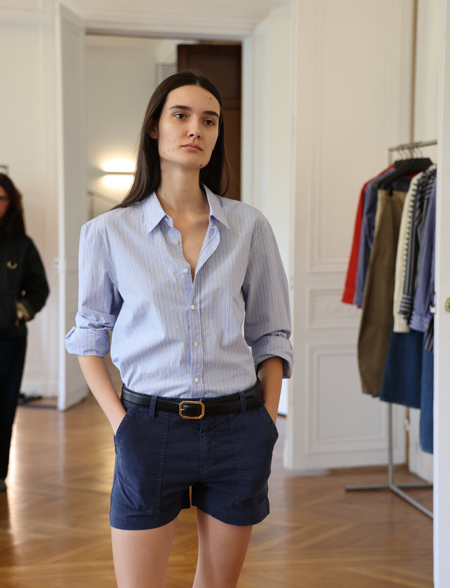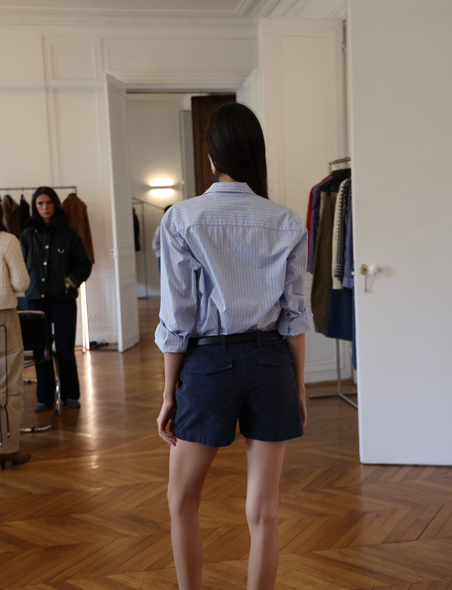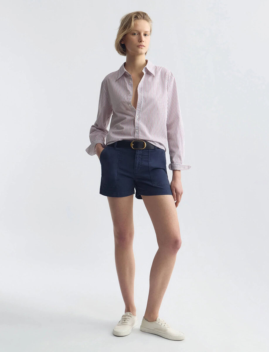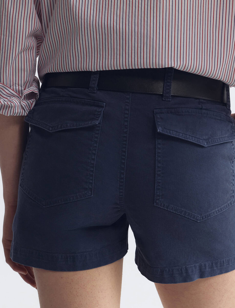 Mid-rise short in Italian brushed cotton twill. Oversized patch pockets at front and back. Back seams. Zip fly. Shank closure. Belt loops.