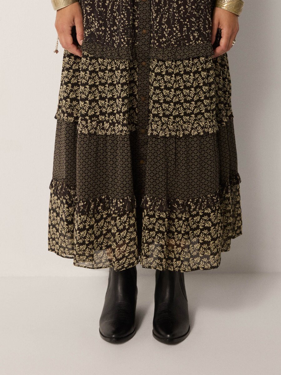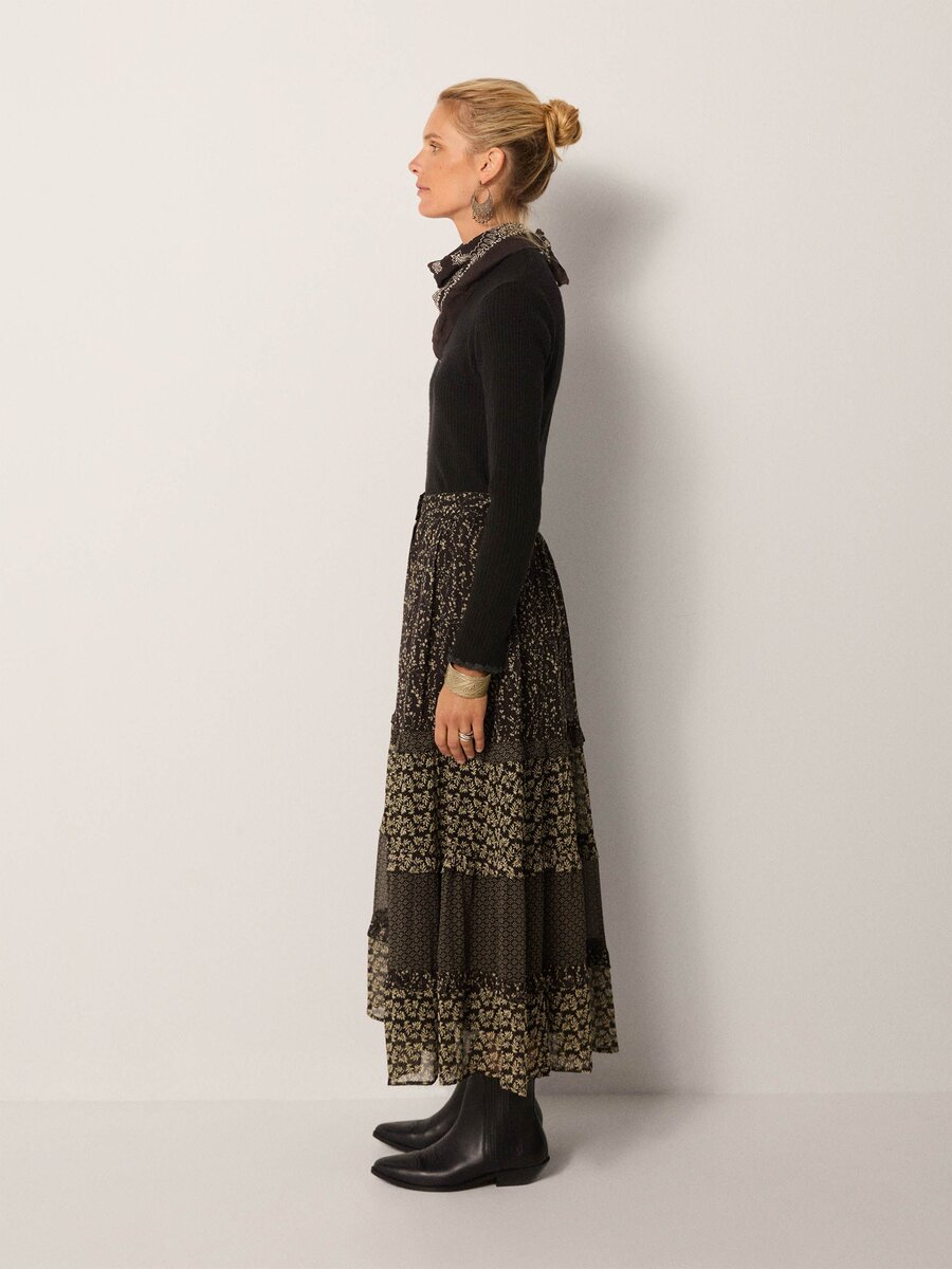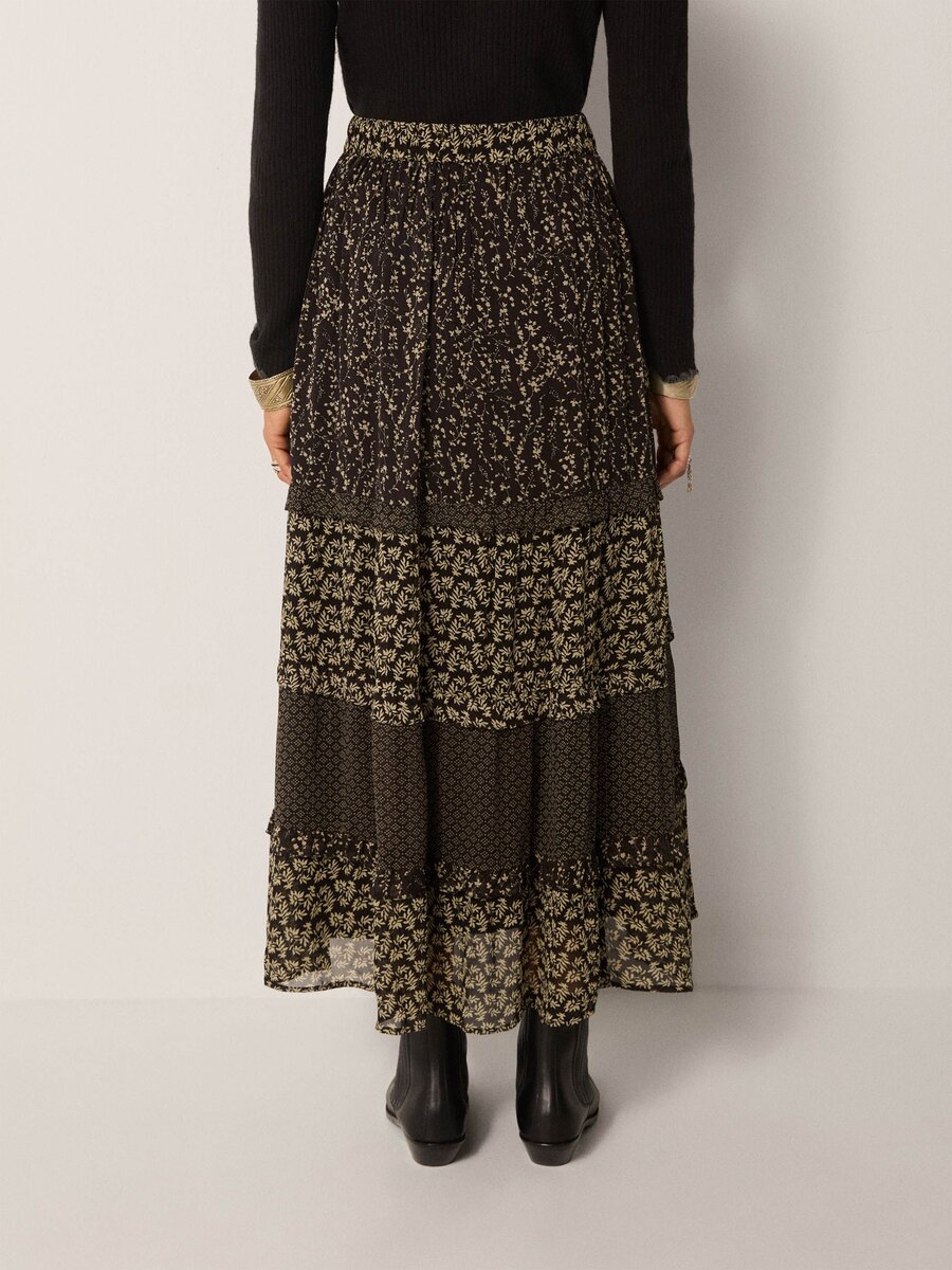 חצאית מקסי שחורה עם הדפס פרחוני עדין בגווני זהב, עשויה בד קליל ונשפך.