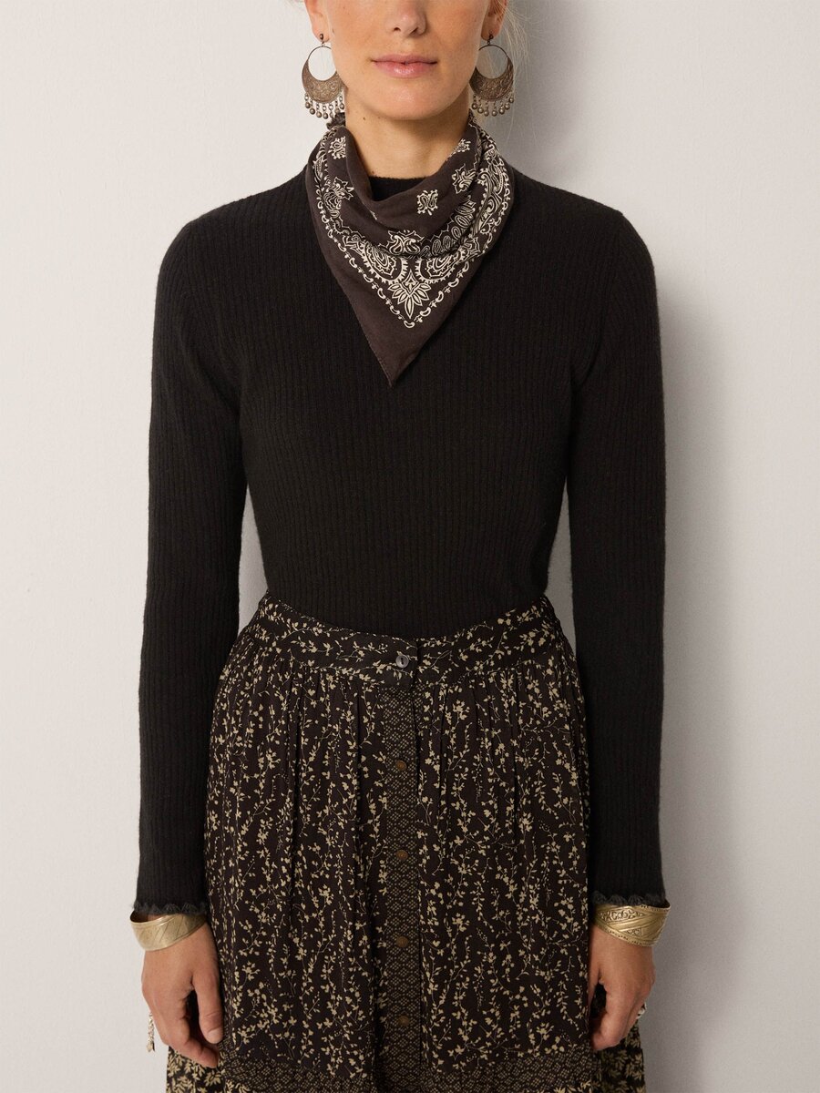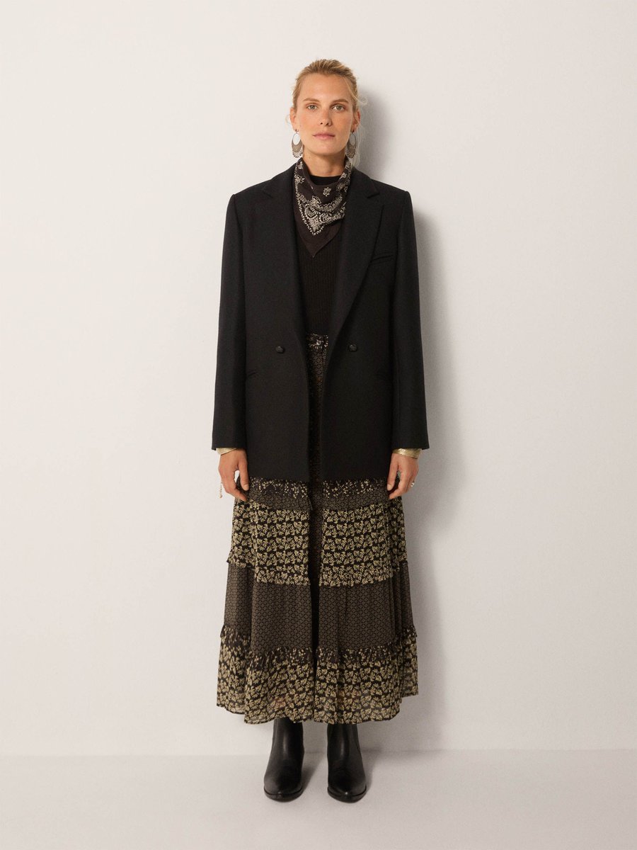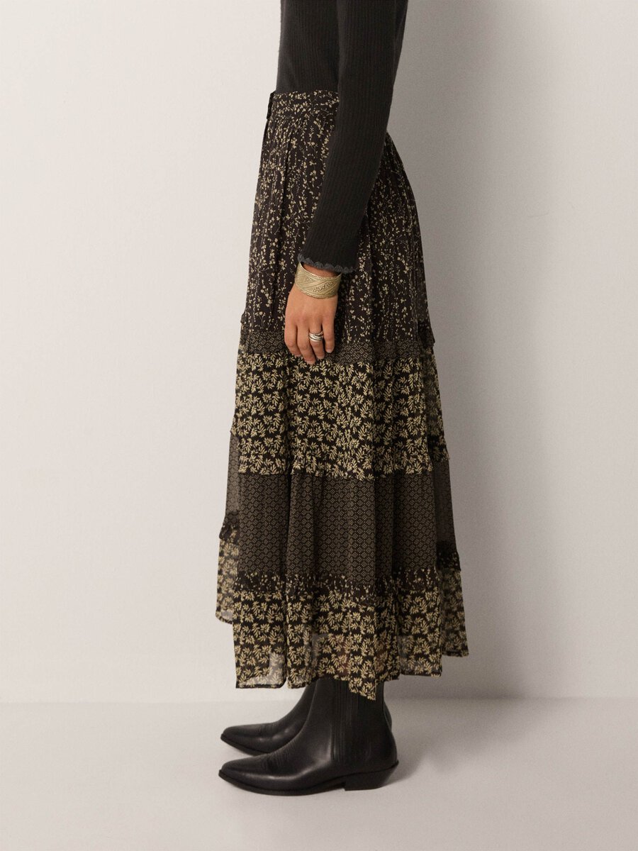 חצאית מקסי שחורה עם הדפס פרחוני עדין בגווני זהב, עשויה בד קליל ונשפך.