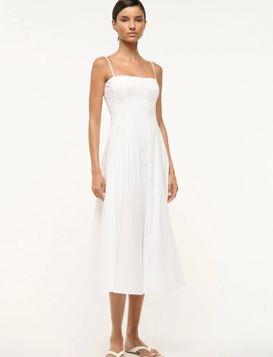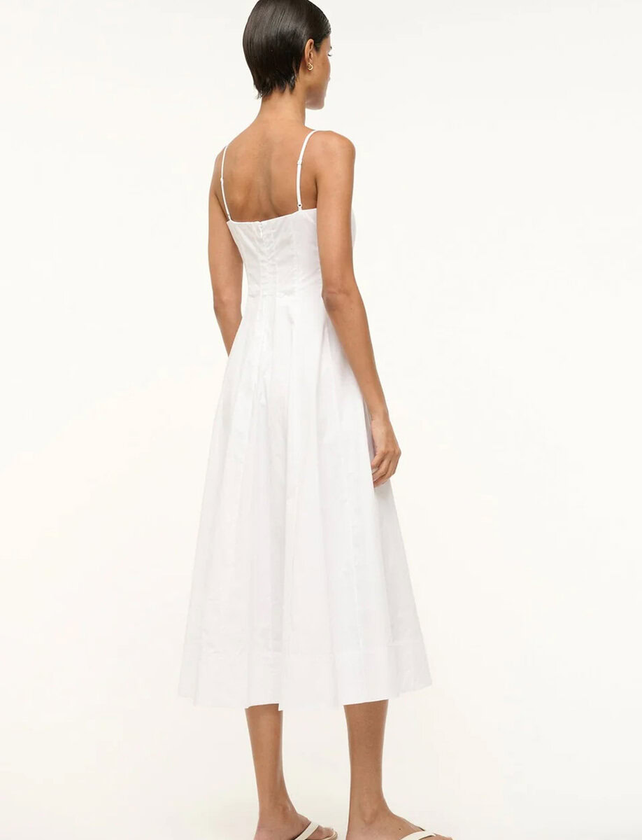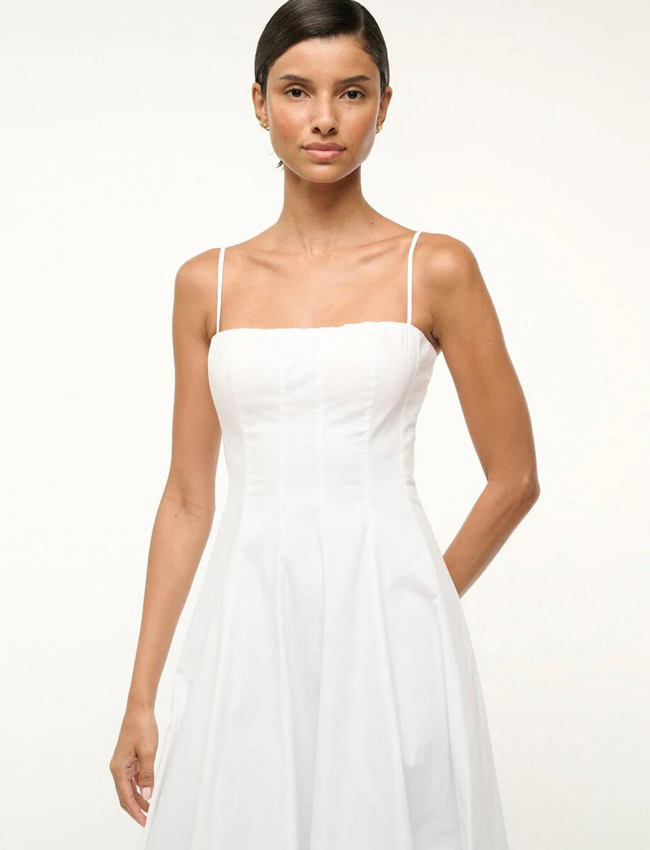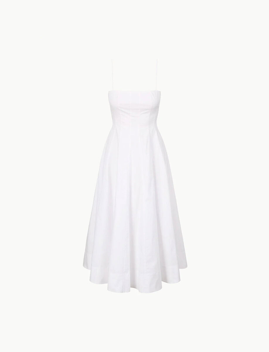 Introducing the Wylie, our newest midi dress crafted in our classic cotton poplin fabric. This style features a corset-style panel construction as seen in the Wells Dress, spaghetti straps and a straight neckline.