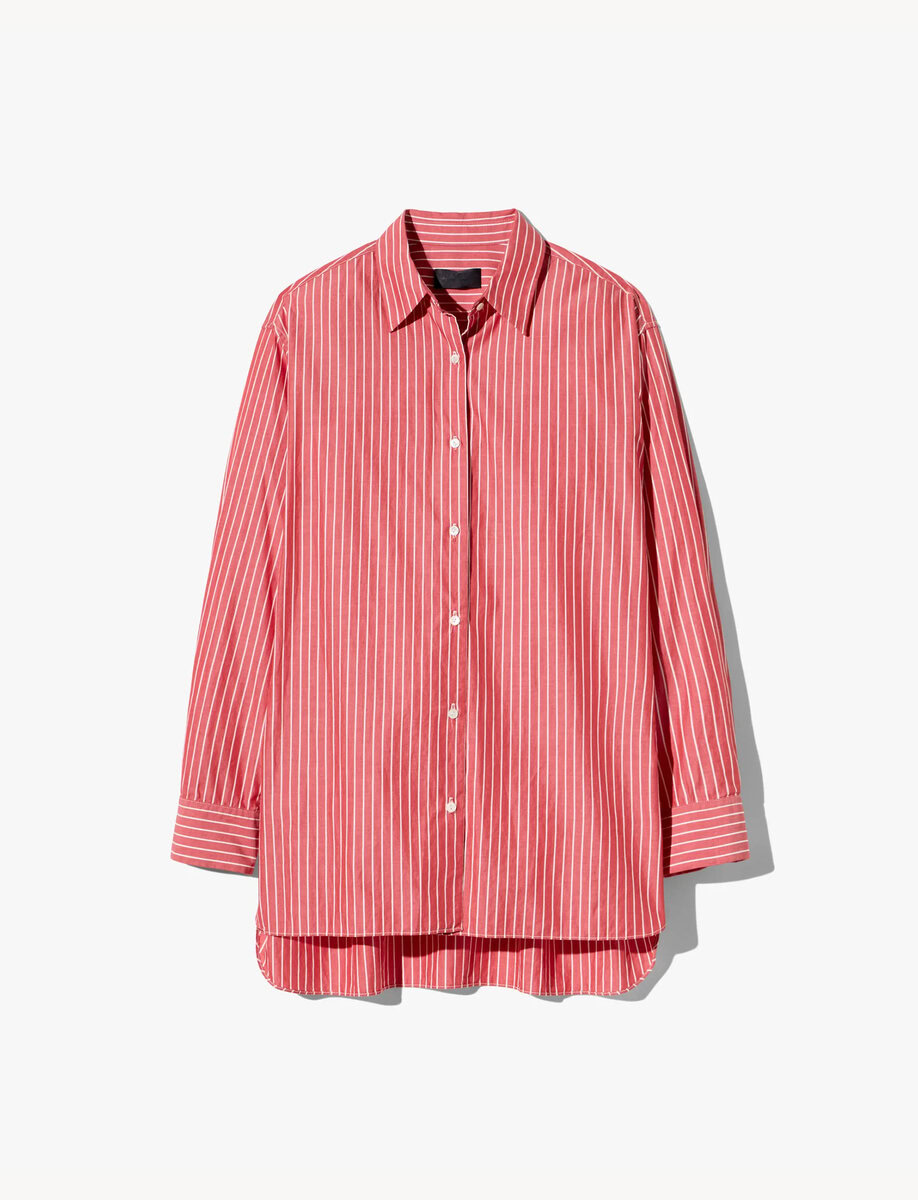 Oversized button down shirt in Italian cotton poplin. Buttoned center front placket and sleeve cuff. Exaggerated shirt-tail hem & body length.
